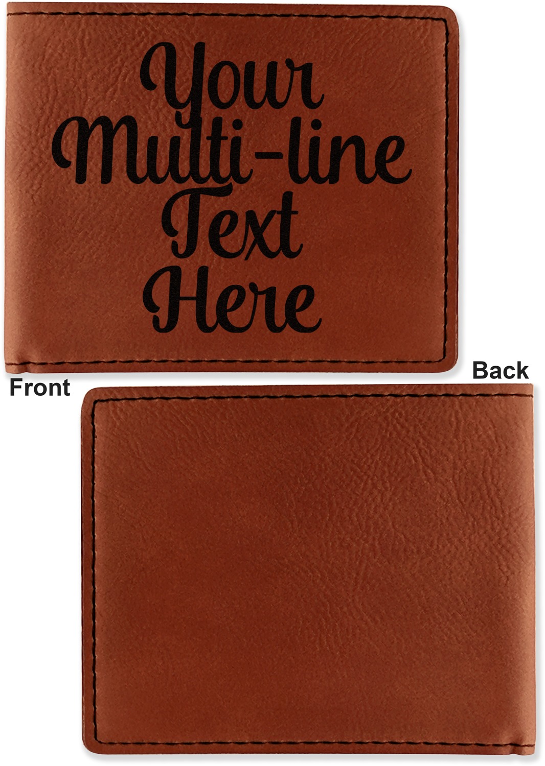 Your bifold wallet will be personalized by laser engraving, which will be a black color on the wallet. Choose a graphic, text, or monogram to personalize your wallet. There are thousands of choices in our design center.