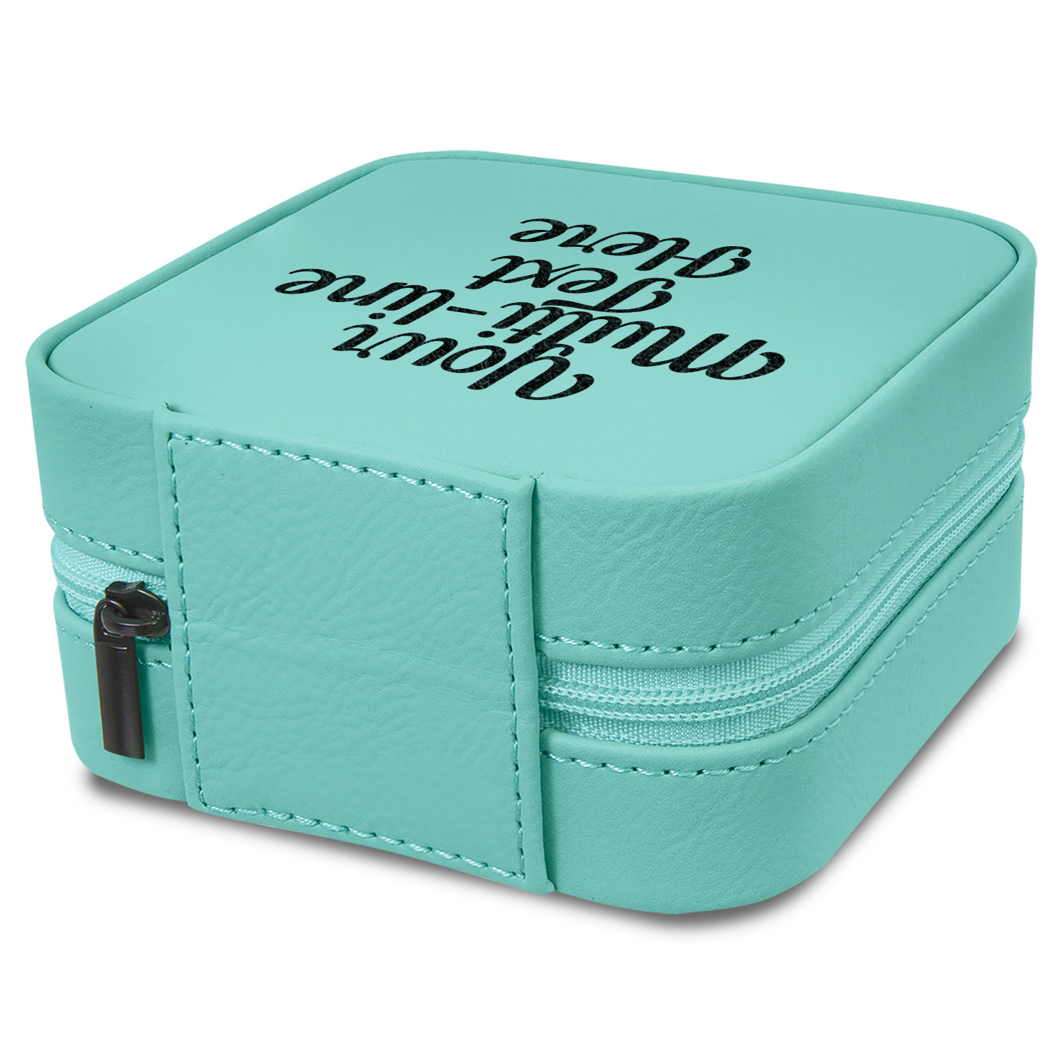 This square zippered travel jewelry box is made from leatherette and is available in four colors - classic cognac / rawhide, a beautiful teal. navy blue or pink. The tan colored soft velvet inside has compartments and hooks for all your jewelry - rings, chains, earrings, bangles etc.