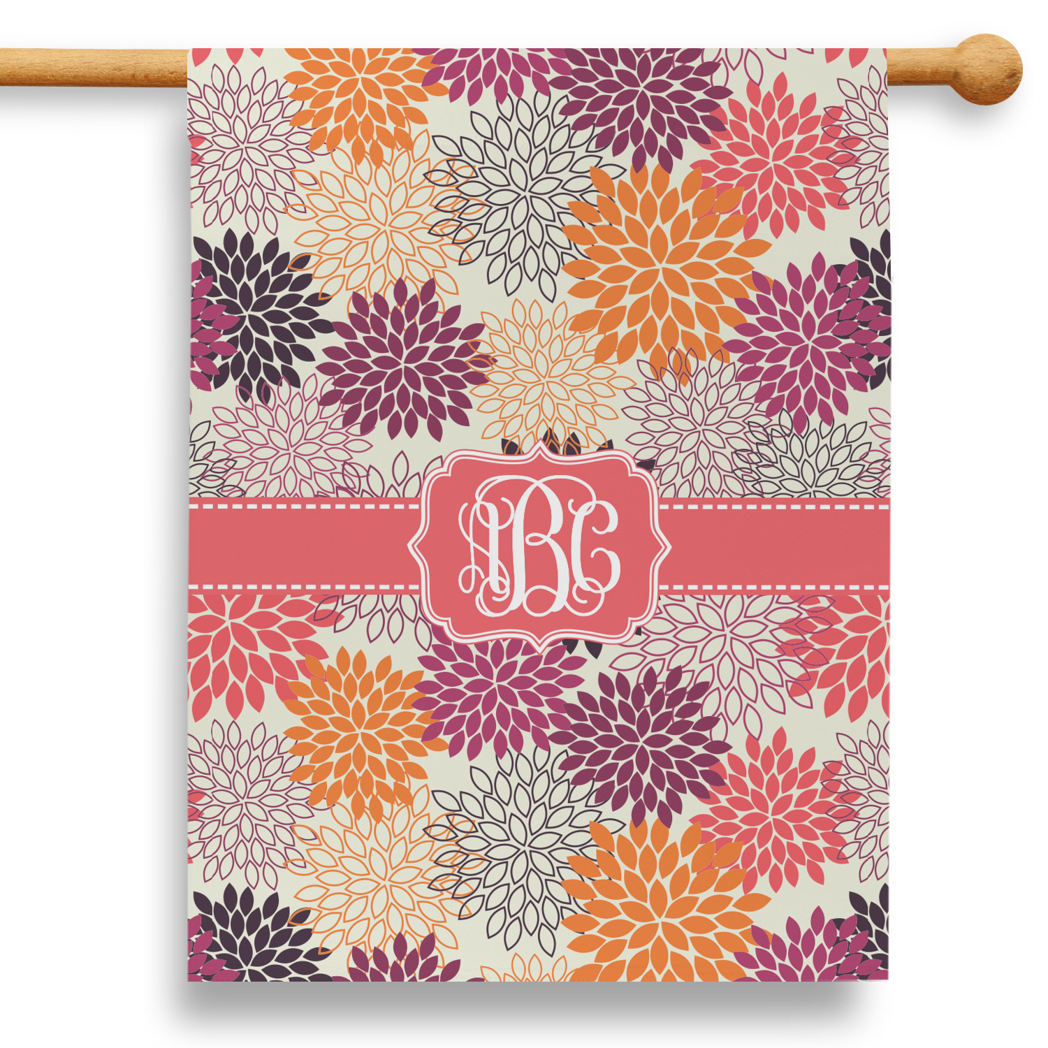 Autumn is in the air. You can feel the cool fall breeze when you see the fall foliage of red, orange, and plum mums on a tan background. The design has a classic ribbon with a decorative label in a beautiful fall color of blood orange. The personalization is an interlocking monogram, but can just as easily be a name, an initial or any text that you would like.