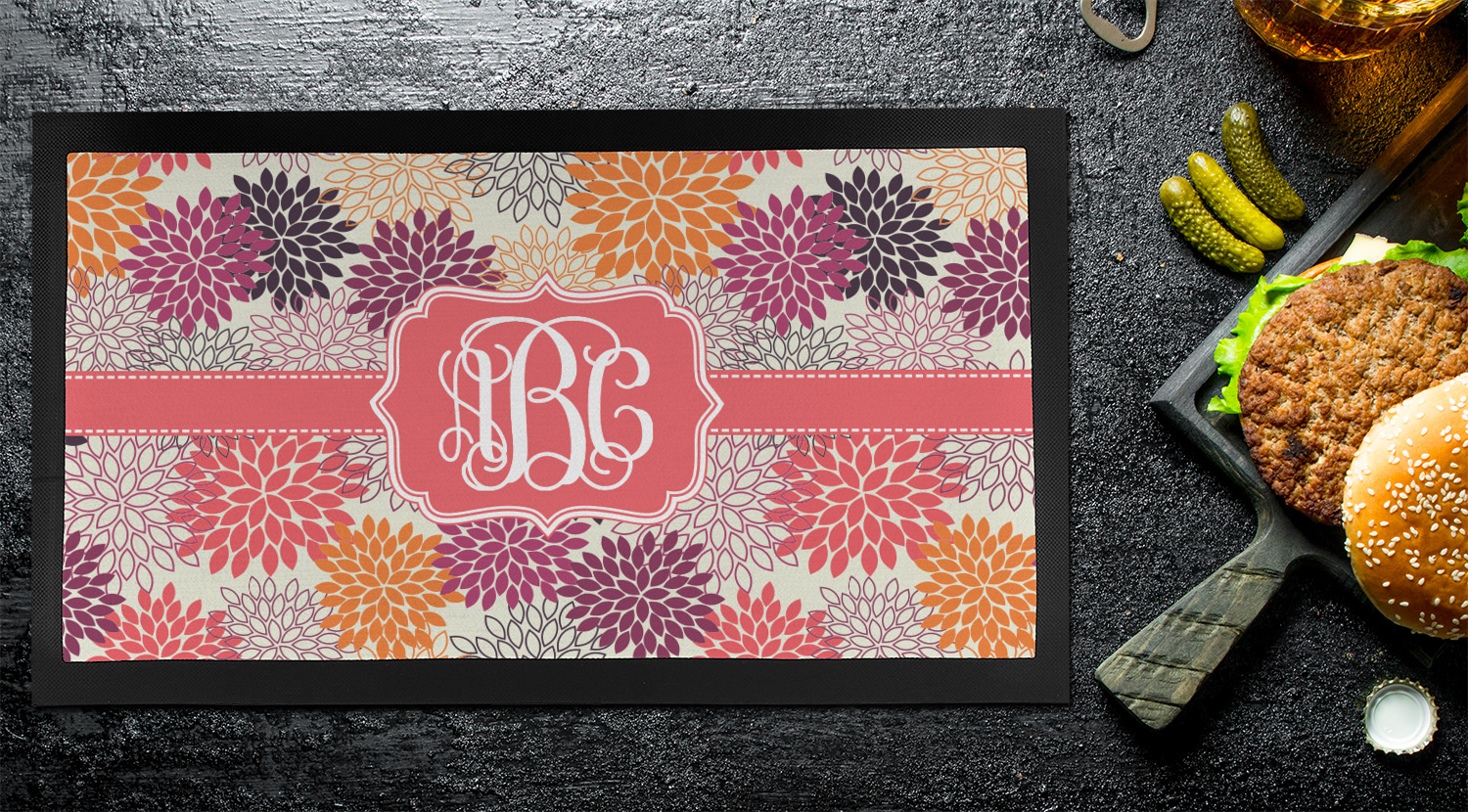 Autumn is in the air. You can feel the cool fall breeze when you see the fall foliage of red, orange, and plum mums on a tan background. The design has a classic ribbon with a decorative label in a beautiful fall color of blood orange. The personalization is an interlocking monogram, but can just as easily be a name, an initial or any text that you would like.