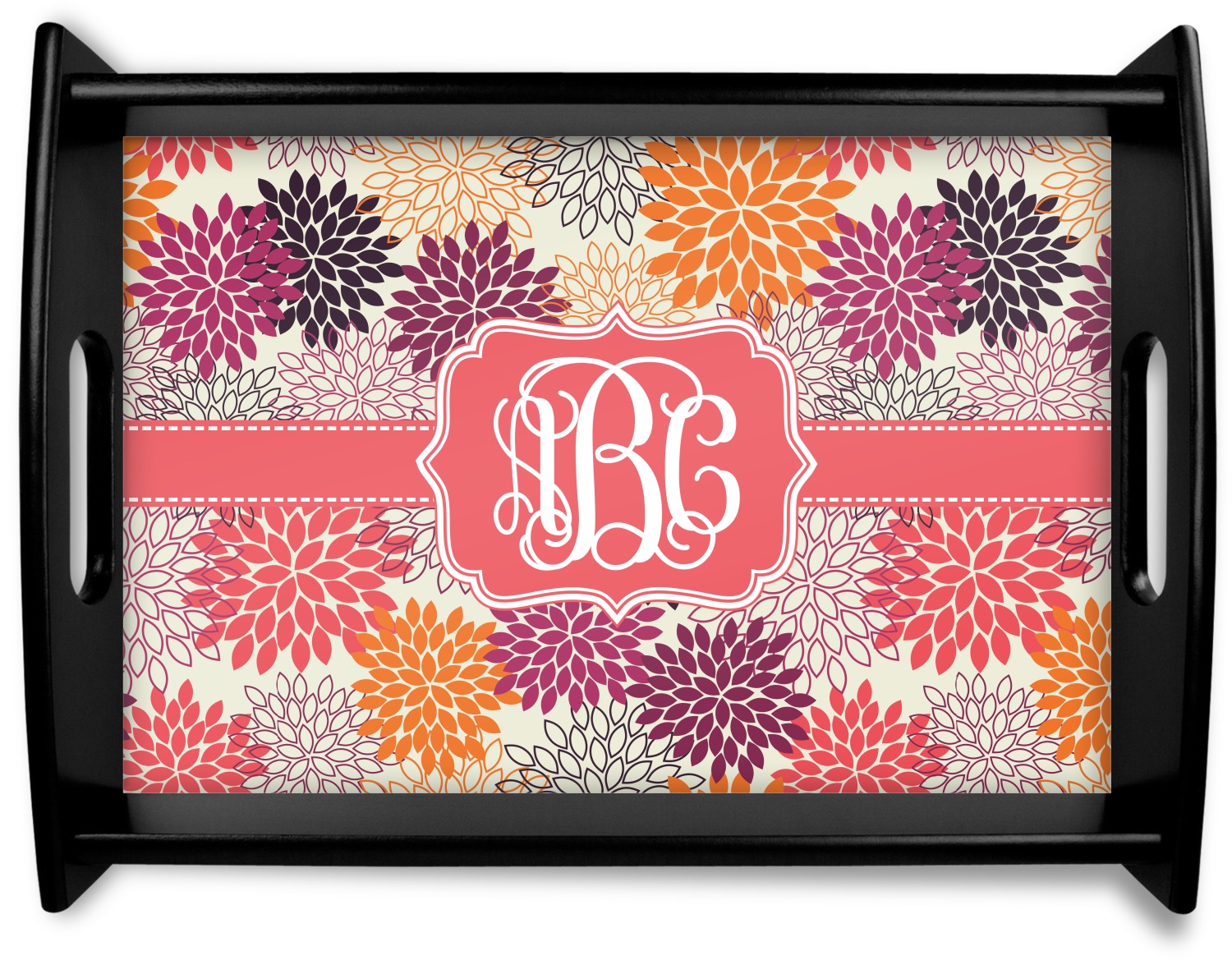 This serving tray with handles features square edges and two rounded sides, creating a very modern look. Each side is fabricated from a beautifully cut, natural wood. The bottom of the interior of the tray displays your customized design in bright, vibrant color. The tray is sold in both a black color and a natural wood look. Each variation of the wood serving tray has two sizes: Small, which is 14" x 10" x 2.25", and Large, which is 19.5" x 13.5" x 2.75".