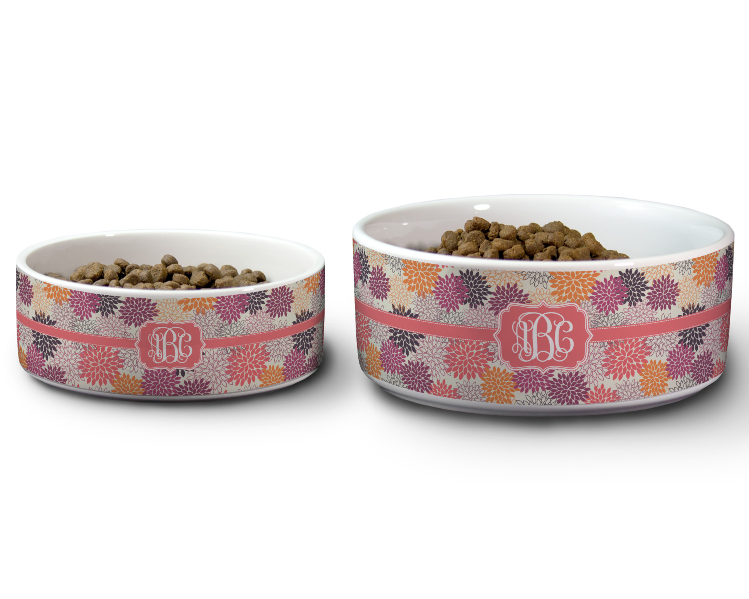 We carry these custom dog bowls in two available sizes: medium and large.The medium is 6 inches in diameter and 2.5 inches tall, and can therefore suit pets who eat up to 2.5 cups of food per meal. The large pet bowl is 7 inches in diameter and 3 inches tall, and suits pets who require up to 4.5 cups of food per meal.