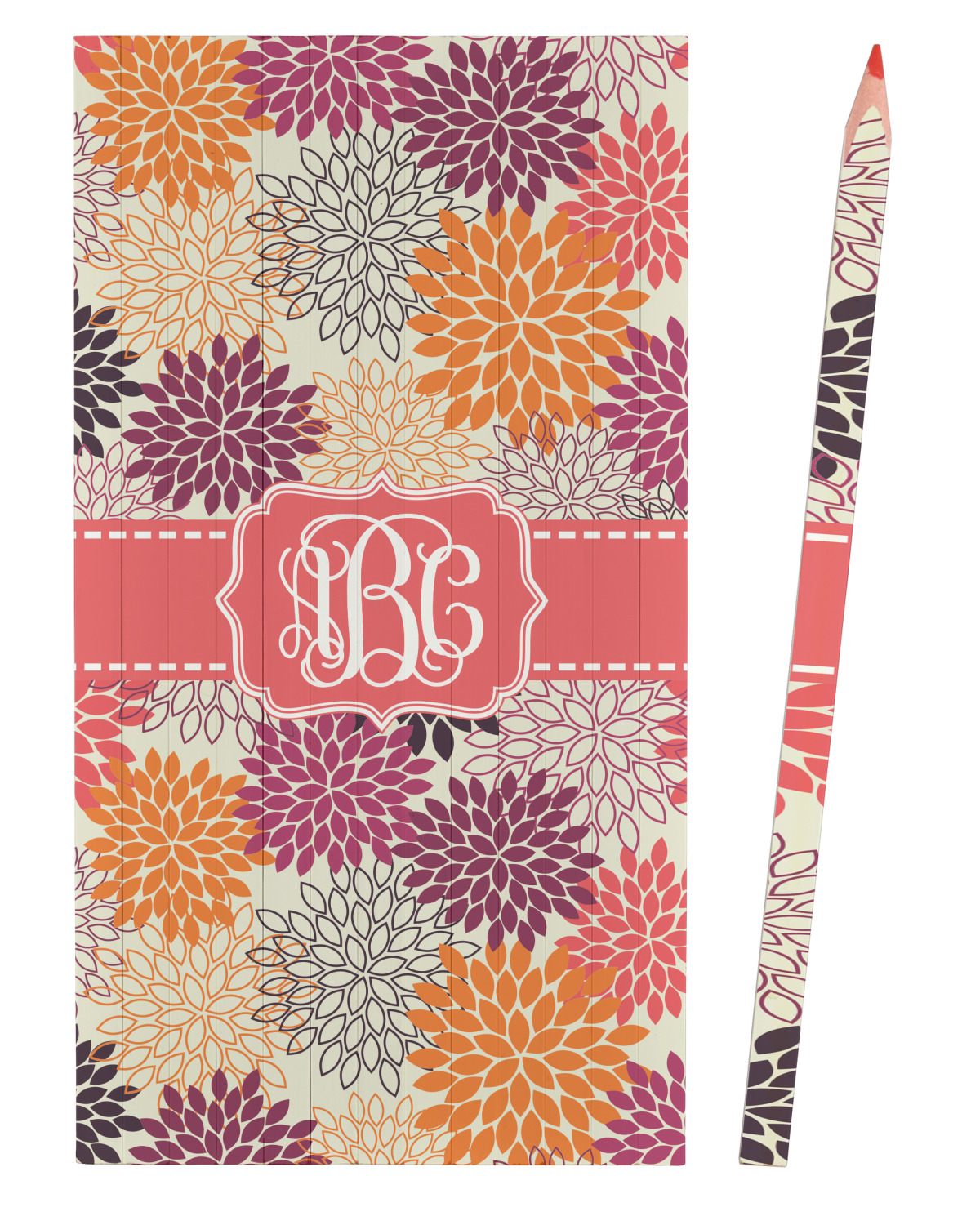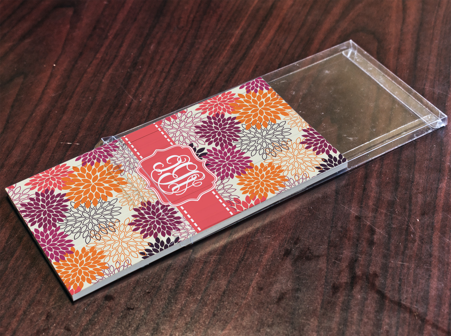 Autumn is in the air. You can feel the cool fall breeze when you see the fall foliage of red, orange, and plum mums on a tan background. The design has a classic ribbon with a decorative label in a beautiful fall color of blood orange. The personalization is an interlocking monogram, but can just as easily be a name, an initial or any text that you would like.