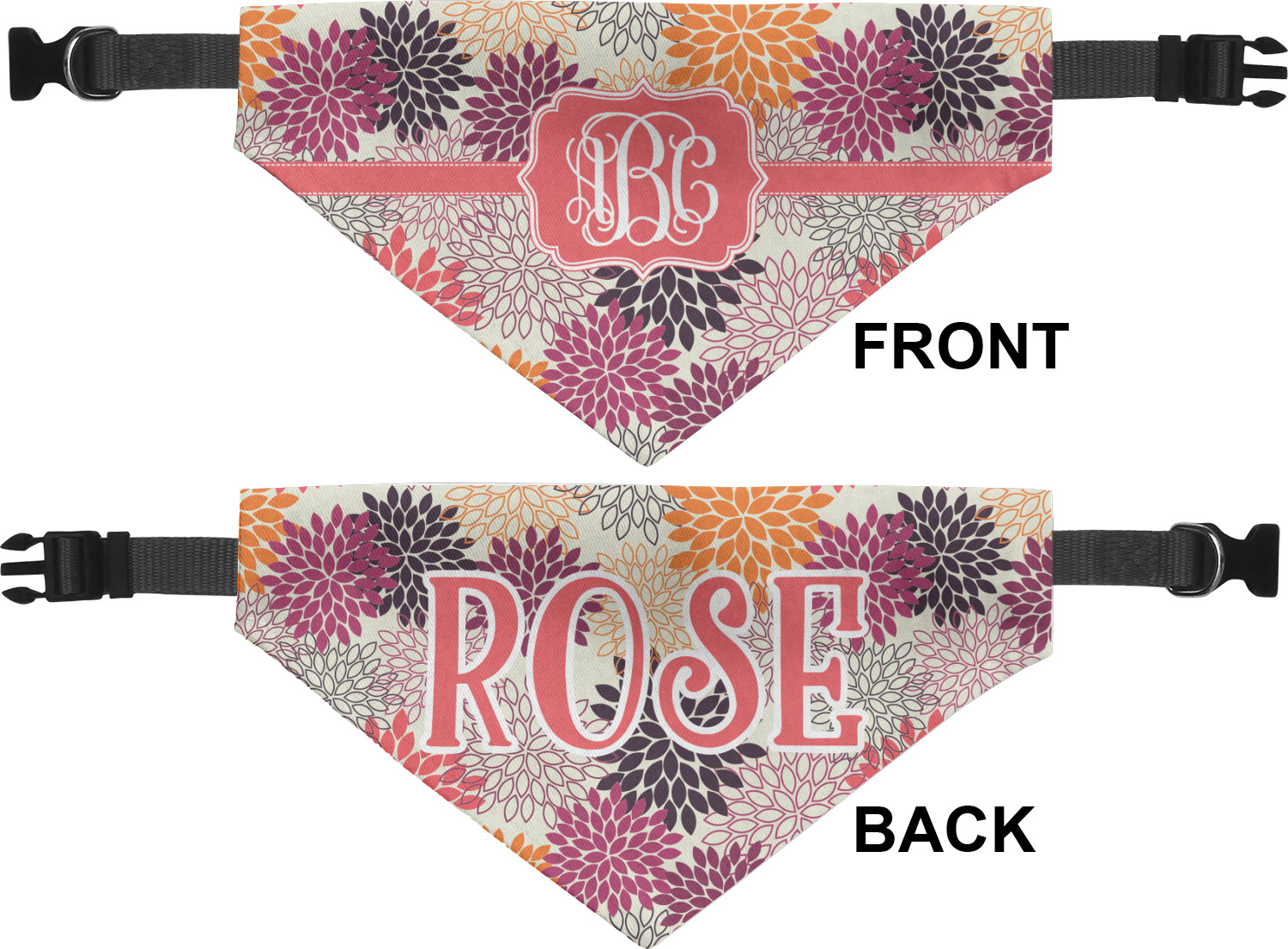 We print the front and back of these dog bandanas with your customized design. The bandana itself is made from a durable polyester, sewn together with a gap large enough to accommodate any collar. Regardless, the bandana includes a plain black, canvas collar with plastic snaps, that can easily be removed if desired. These dog bandana collars are available in four sizes: small, medium, large, and extra large. Please see our sizing chart for more information regarding the dimensions of each size.