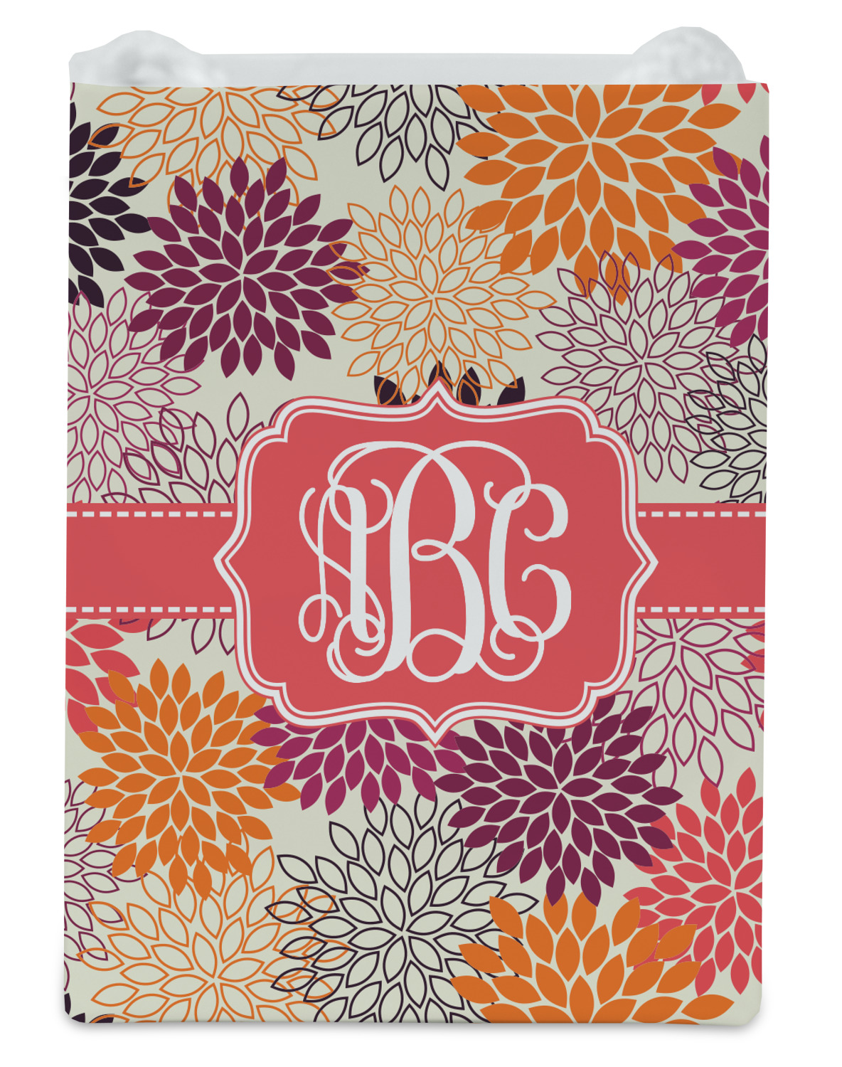 Autumn is in the air. You can feel the cool fall breeze when you see the fall foliage of red, orange, and plum mums on a tan background. The design has a classic ribbon with a decorative label in a beautiful fall color of blood orange. The personalization is an interlocking monogram, but can just as easily be a name, an initial or any text that you would like.