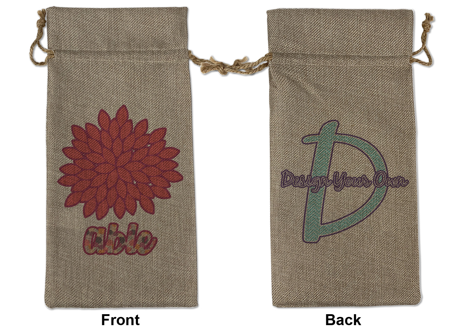 We sell our Burlap Gift Bags in 3 variant sized bags. Made with burlap polyester, each personalized bag can be secured with a twine drawstring pull. Your custom design is available to print on one side or both sides - completely up to you! The sizes of the bags measure approximately 4.5" x 6.5" for the smallest size, 6.5" x 8.0" for the medium size, and 6.5" x 13.5" for the large-sized bag.