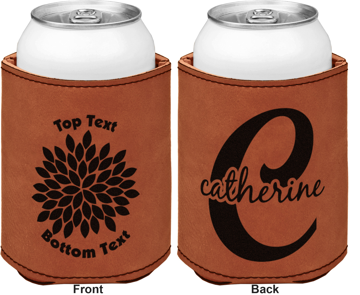 This can sleeve is made from a cognac-brown leatherette and stitched with a sturdy, black thread. A slim padding lines the inside of your can sleeve to allow for a better fit once your drink is inserted. The sleeve itself measures at 4 by 4.5 inches, allowing this custom can sleeve to accommodate most canned drinks. Your personalized design can be engraved on the front and back, or solely the front. When laser-engraved, your design appears as a black coloration which contrasts the leatherette nicely.