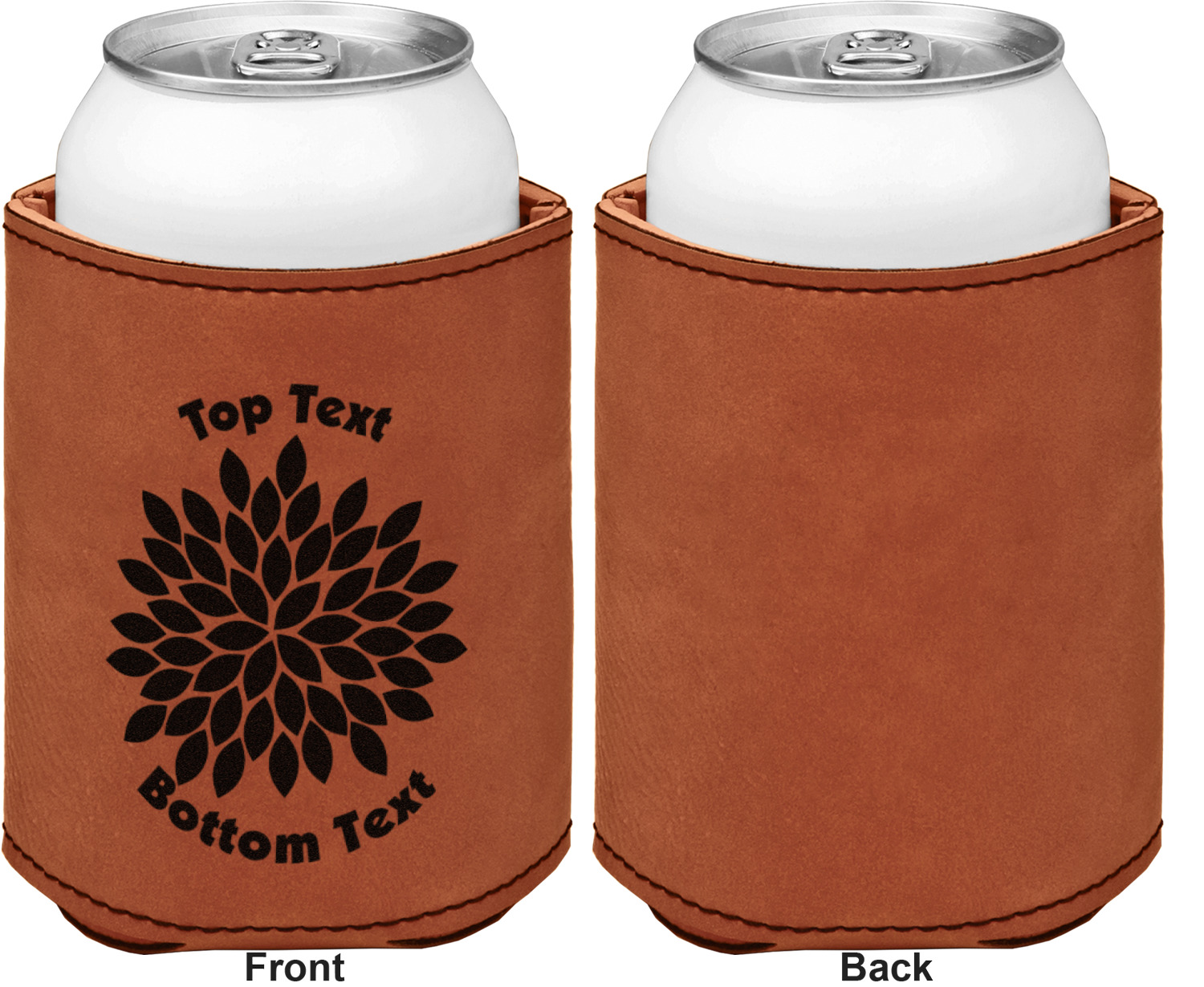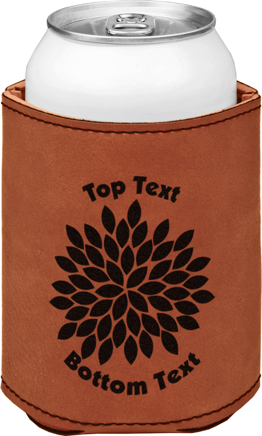 This can sleeve is made from a cognac-brown leatherette and stitched with a sturdy, black thread. A slim padding lines the inside of your can sleeve to allow for a better fit once your drink is inserted. The sleeve itself measures at 4 by 4.5 inches, allowing this custom can sleeve to accommodate most canned drinks. Your personalized design can be engraved on the front and back, or solely the front. When laser-engraved, your design appears as a black coloration which contrasts the leatherette nicely.