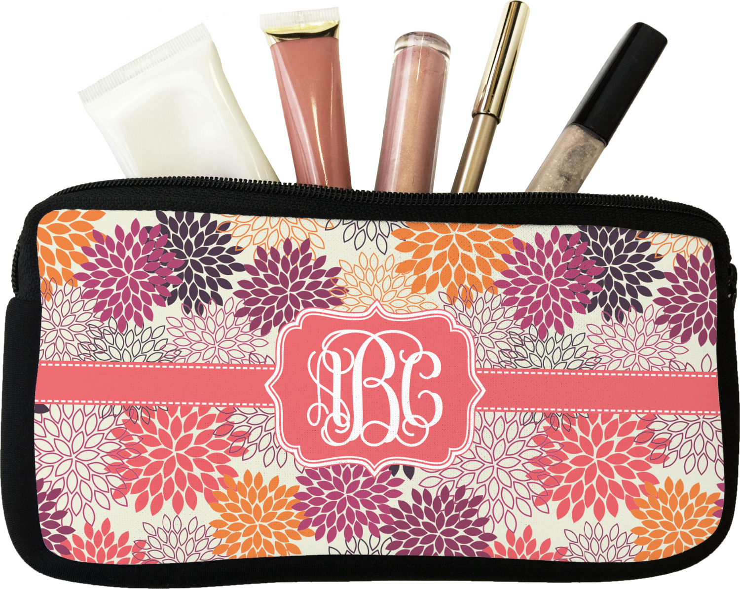 Our personalized makeup bags are available in many different designs, patterns and colors - so you are sure to find one that will love. They are made of neoprene (same material as wet-suits) and thus are water resistant, so spillages in your makeup bag will not end up all over you purse. They are customized on one side and are black on the other side and the zipper is black as well.