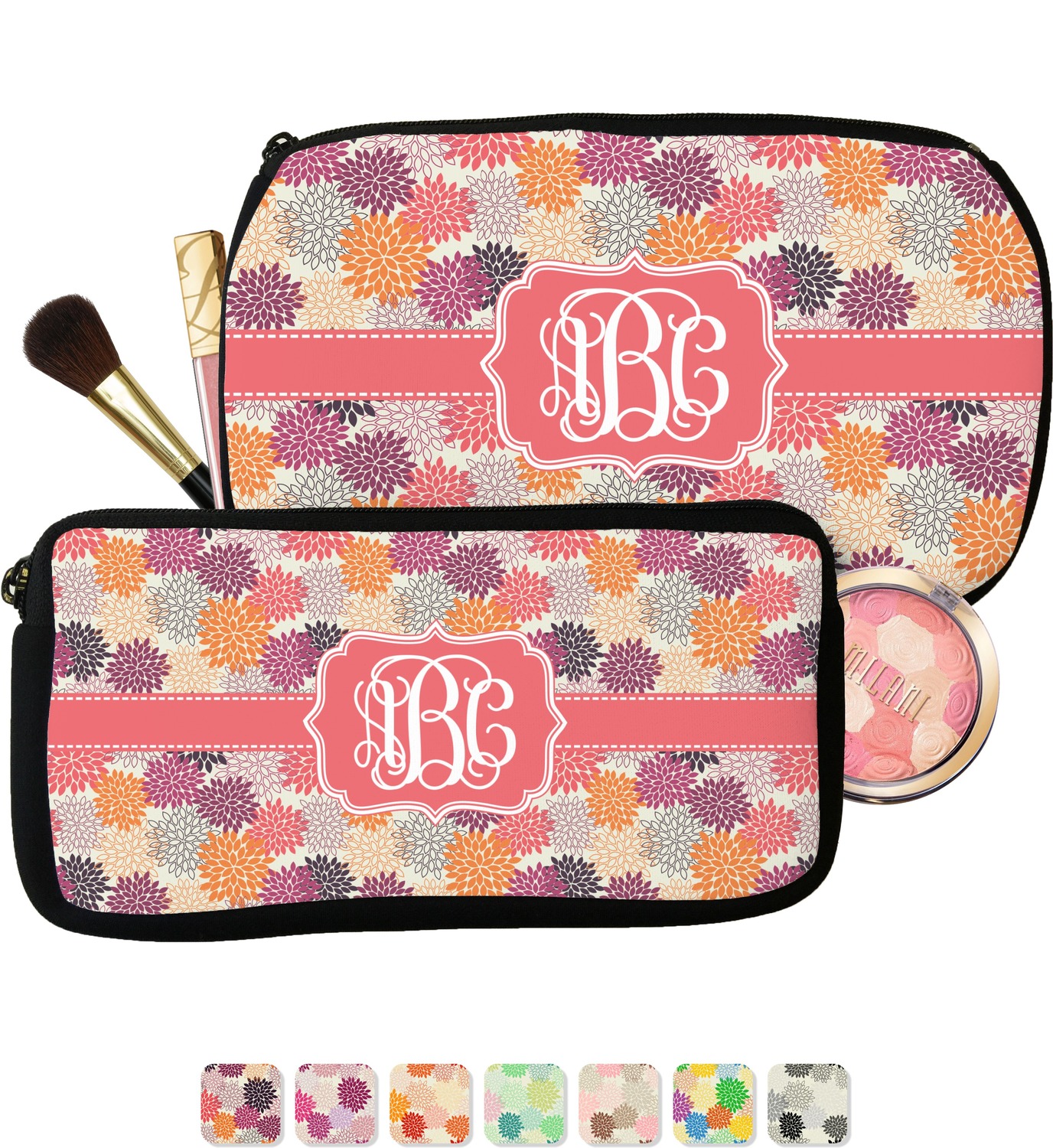 Our personalized makeup bags are available in many different designs, patterns and colors - so you are sure to find one that will love. They are made of neoprene (same material as wet-suits) and thus are water resistant, so spillages in your makeup bag will not end up all over you purse. They are customized on one side and are black on the other side and the zipper is black as well.
