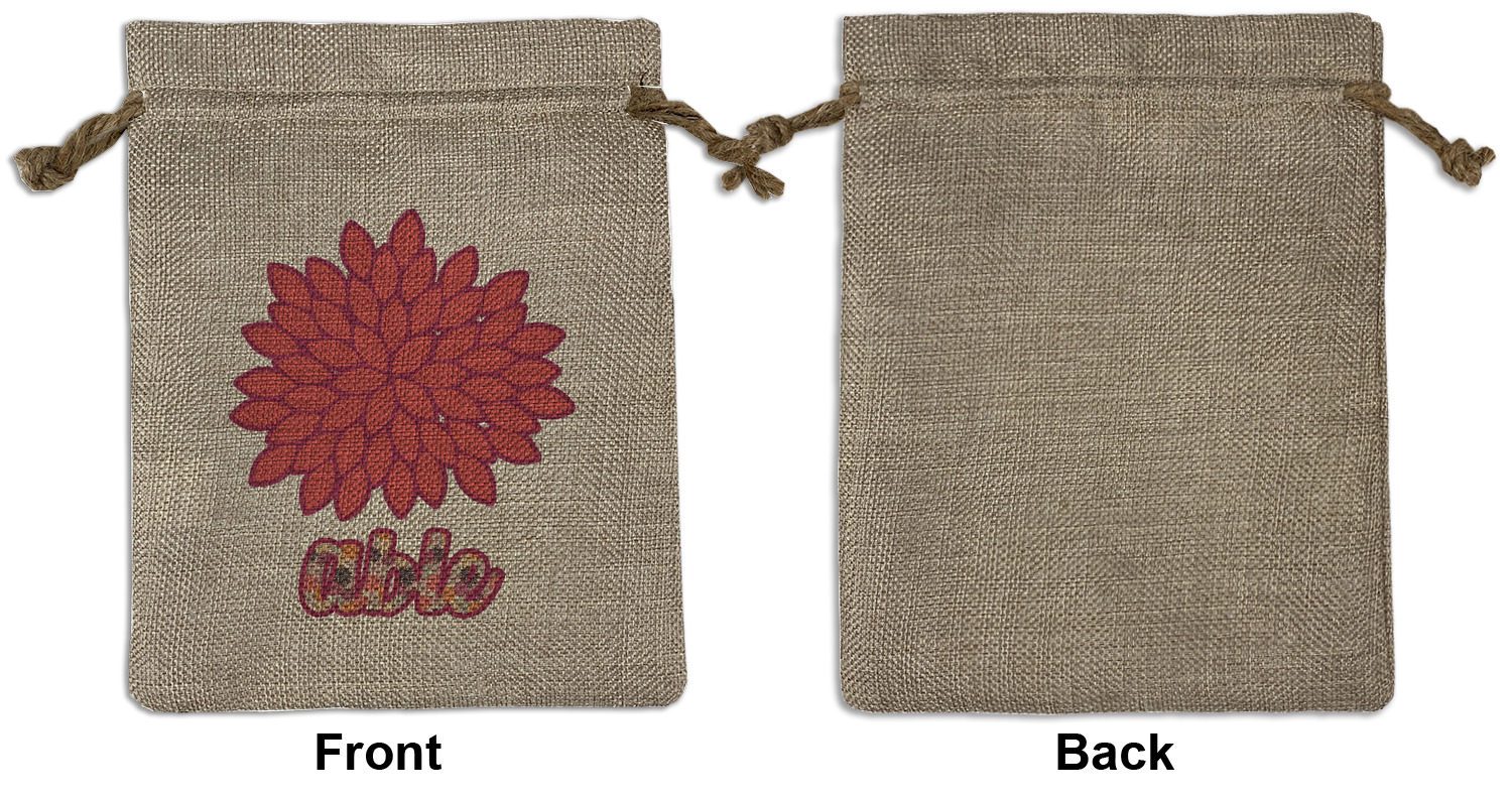 We sell our Burlap Gift Bags in 3 variant sized bags. Made with burlap polyester, each personalized bag can be secured with a twine drawstring pull. Your custom design is available to print on one side or both sides - completely up to you! The sizes of the bags measure approximately 4.5" x 6.5" for the smallest size, 6.5" x 8.0" for the medium size, and 6.5" x 13.5" for the large-sized bag.