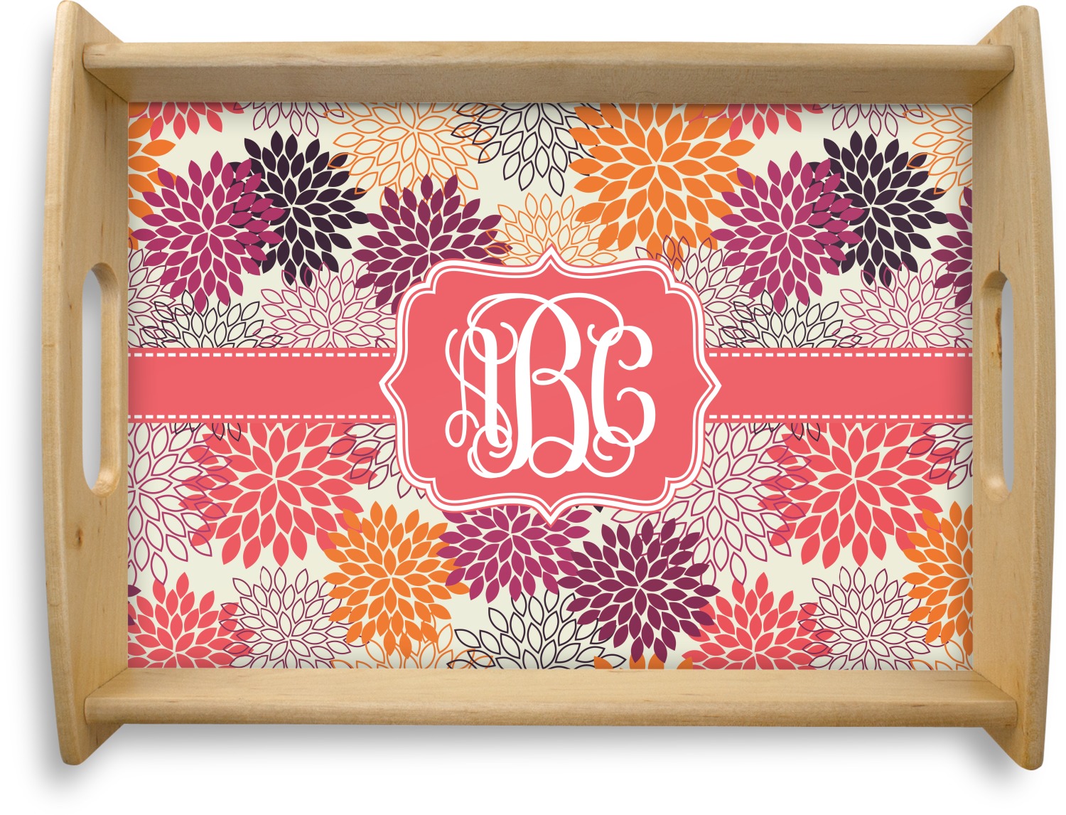 This serving tray with handles features square edges and two rounded sides, creating a very modern look. Each side is fabricated from a beautifully cut, natural wood. The bottom of the interior of the tray displays your customized design in bright, vibrant color. The tray is sold in both a black color and a natural wood look. Each variation of the wood serving tray has two sizes: Small, which is 14" x 10" x 2.25", and Large, which is 19.5" x 13.5" x 2.75".