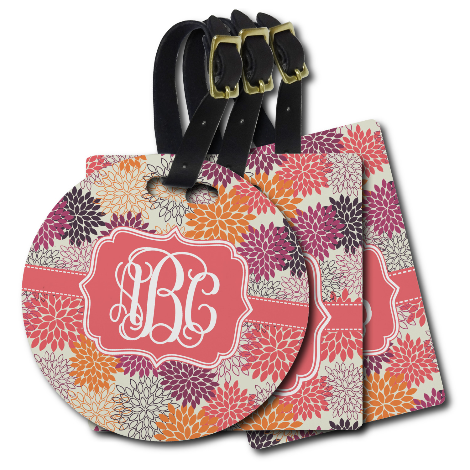 These personalized bag tags are sold in a variety of shapes, so that you may find the product that meets your vision exactly. We sell a round luggage tag, which measures at approximately 4" x 4". Our square luggage tag is about 3.5" x 3.5", while our rectangular version is 2.75" x 4 ".