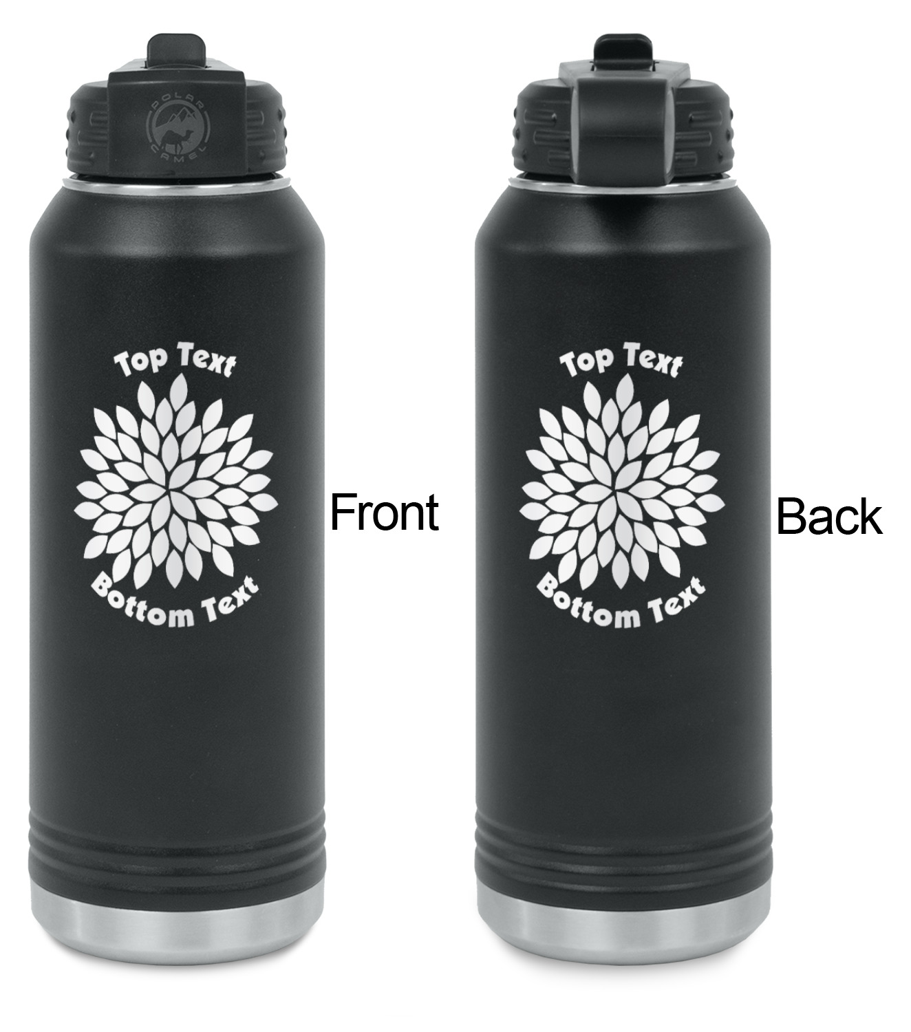 Your design is laser engraved on the water bottles. The engraving removes the black powder coating in the designed area to expose the silver stainless steel underneath.