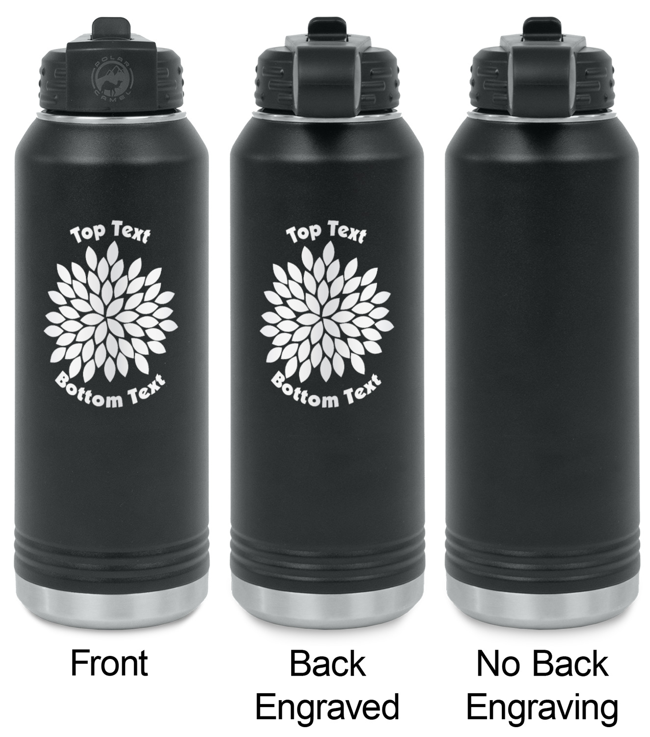Your design is laser engraved on the water bottles. The engraving removes the black powder coating in the designed area to expose the silver stainless steel underneath.