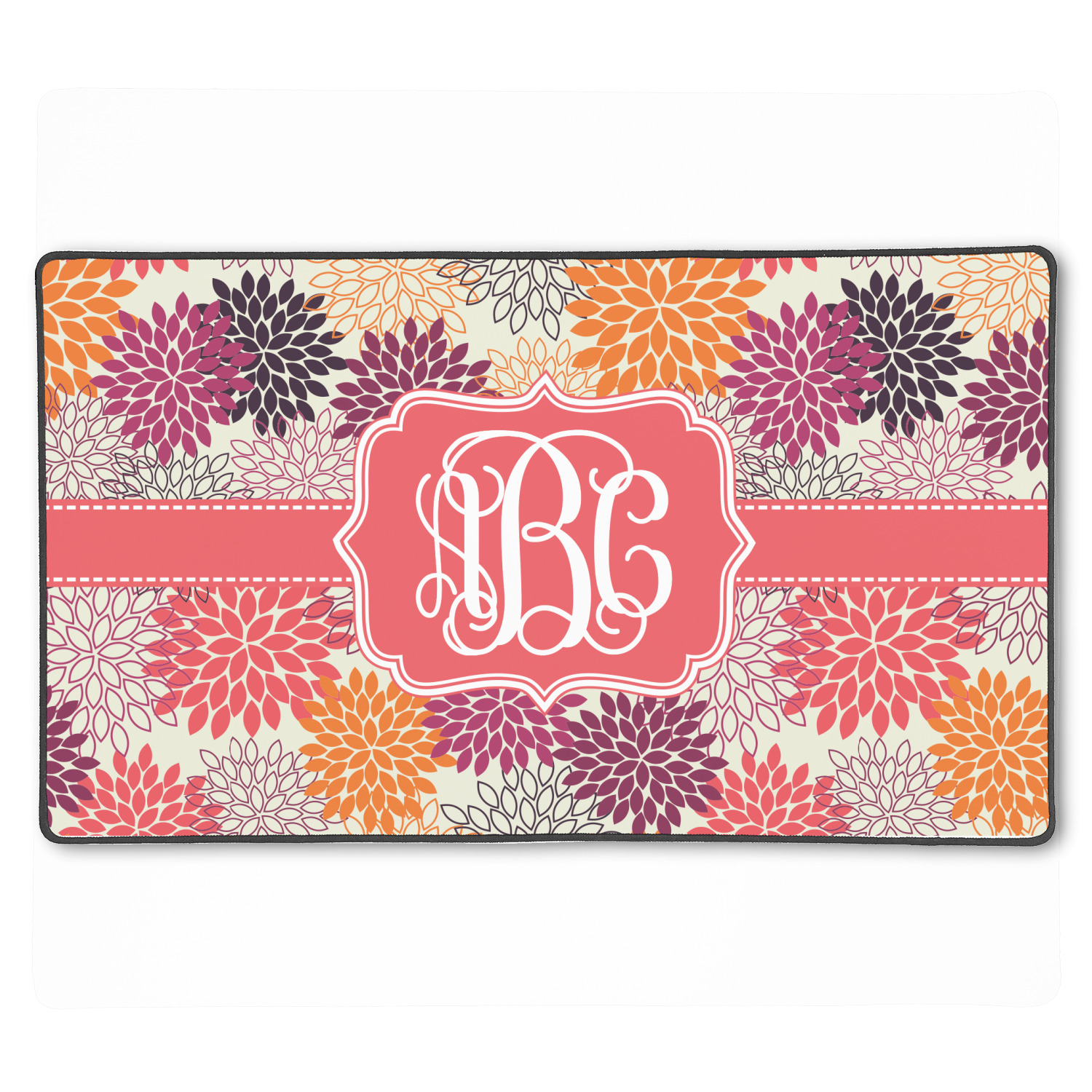 Autumn is in the air. You can feel the cool fall breeze when you see the fall foliage of red, orange, and plum mums on a tan background. The design has a classic ribbon with a decorative label in a beautiful fall color of blood orange. The personalization is an interlocking monogram, but can just as easily be a name, an initial or any text that you would like.