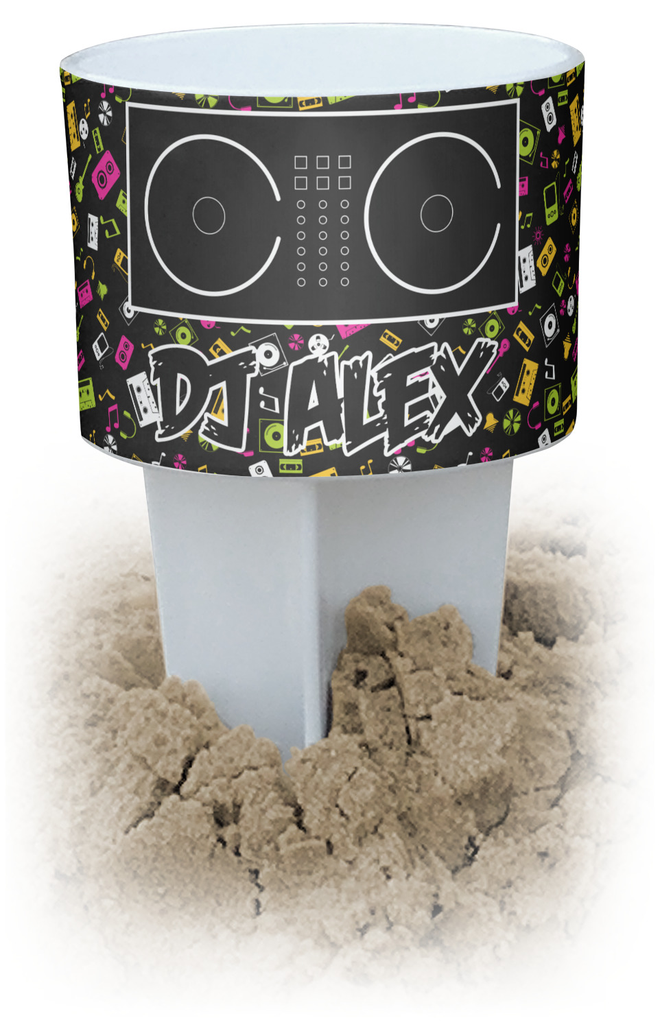 This cup holder has a large stake at its bottom that anchors it to the sand or ground below, while the cup holder rests above the stake. The entire drink holder is made of durable plastic and displays your customization around the cup holder portion. We sell these personalized beach spikers in two different colors: black and white.