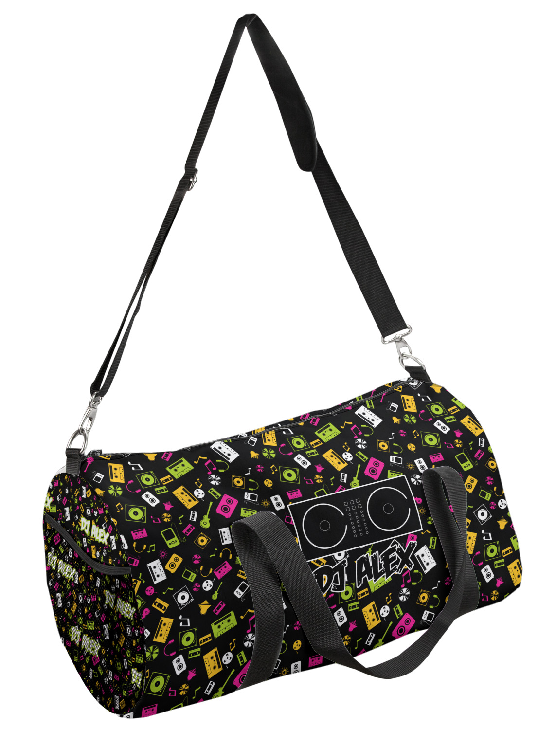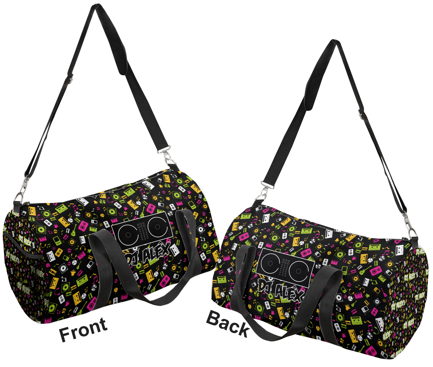 This duffle is a sturdy bag made of a canvas material. It comes in two sizes: Small (19"W x 9.5"H x 9.5"D) and Large (23"W x 12"H x 12"D). The bag is a cylindrical shape with a black adjustable strap and two handles. On one side is an elastic pouch to put a waterbottle or other small item. Your product will be sublimated with your design and is able to be designed on the front, back, and sides. Be sure to remember that the straps may cut into parts of your design if you upload your own artwork.
