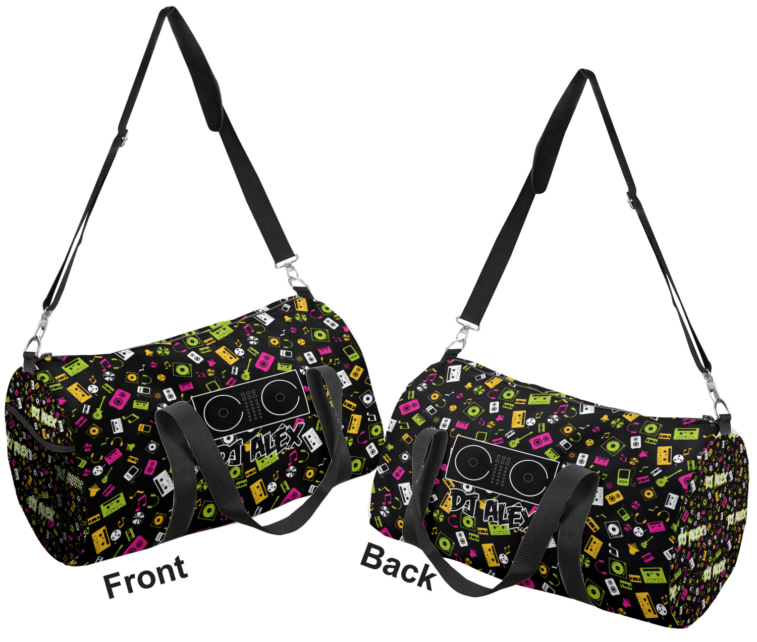 This duffle is a sturdy bag made of a canvas material. It comes in two sizes: Small (19"W x 9.5"H x 9.5"D) and Large (23"W x 12"H x 12"D). The bag is a cylindrical shape with a black adjustable strap and two handles. On one side is an elastic pouch to put a waterbottle or other small item. Your product will be sublimated with your design and is able to be designed on the front, back, and sides. Be sure to remember that the straps may cut into parts of your design if you upload your own artwork.
