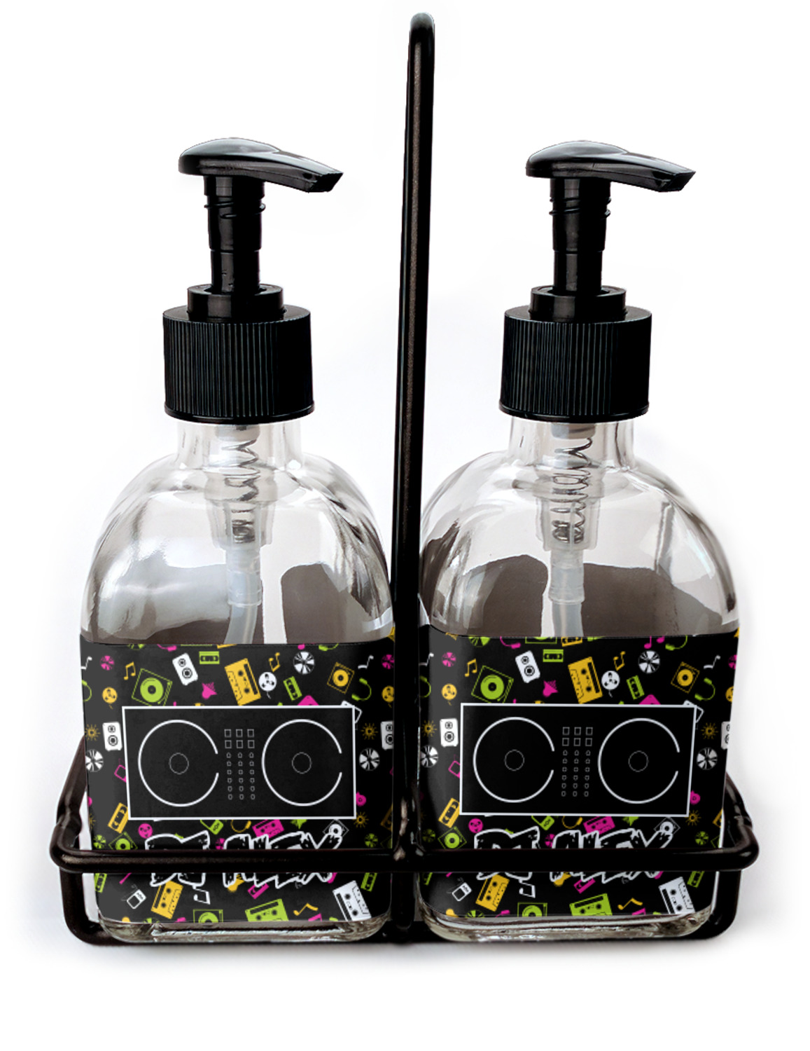 You can purchase these personalized soap dispensers as singulars, or as a set with two bottles. With your purchase of the set, we include a black frame that complements the black color of the pumps and adds to the overall classy look of the piece.