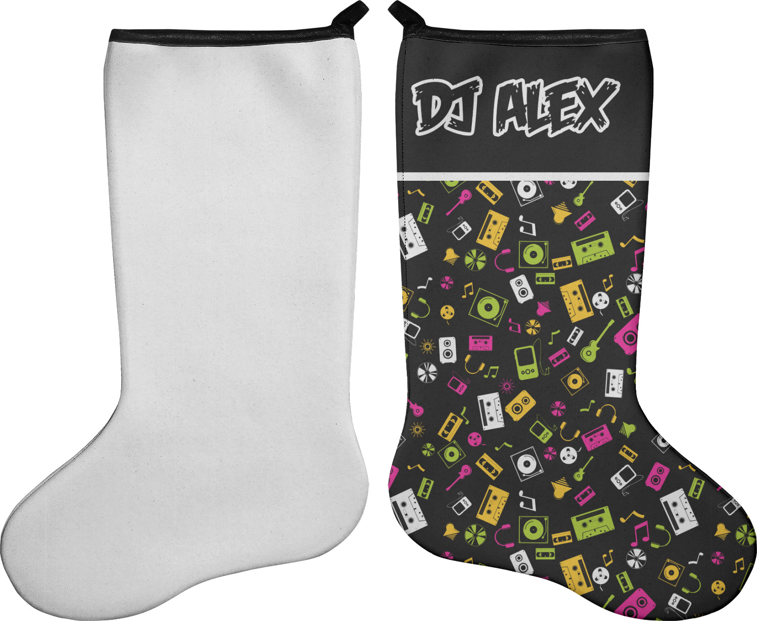 These 17" x 11" stockings are made of neoprene and have a black trim to give them a fantastic finished look. Your very own design is printed right onto the stocking, either single sided with white on the back or double sided where can use the same or different designs / patterns on the front and the back - the choice is yours. At the top of the stocking is a 2" loop for hanging.