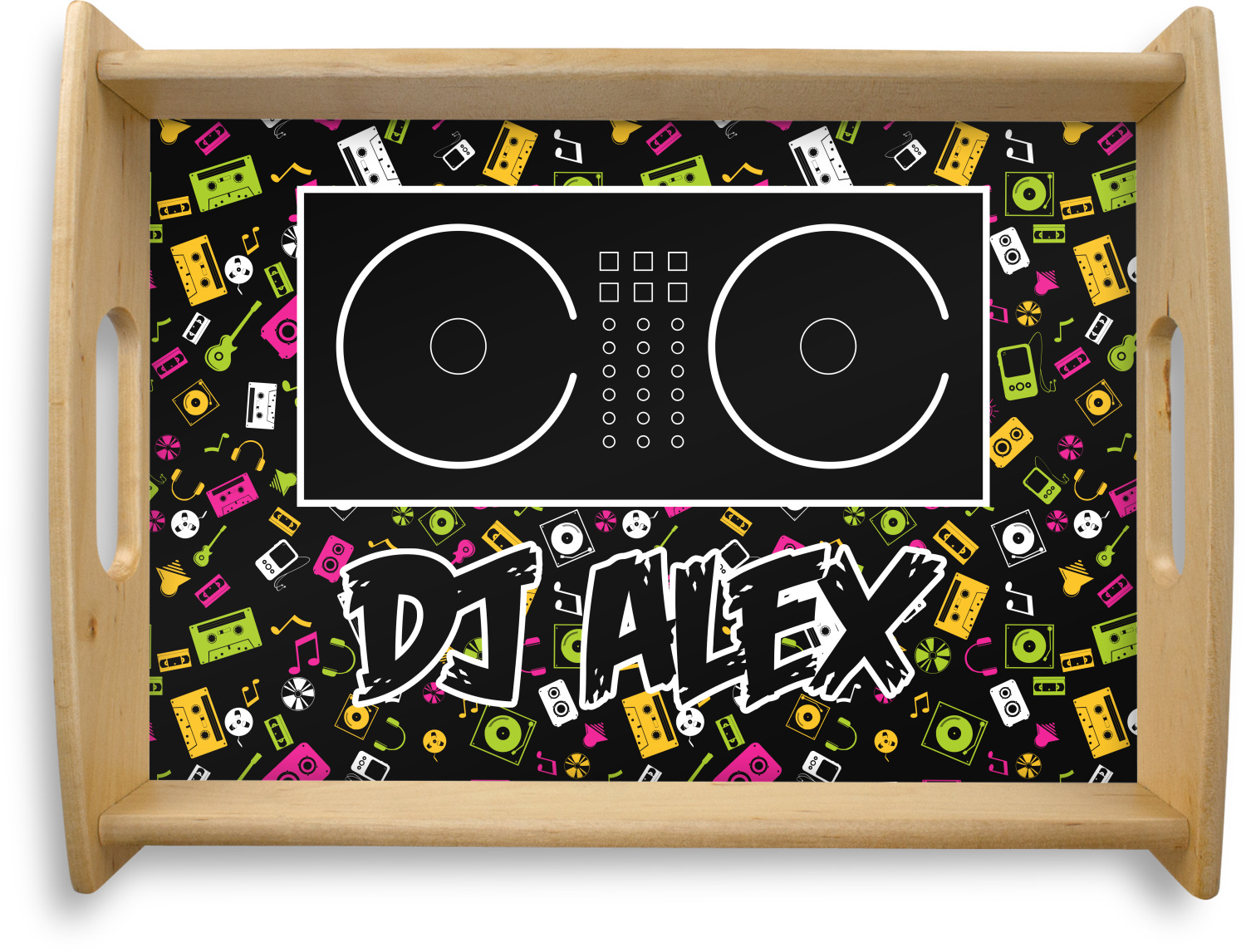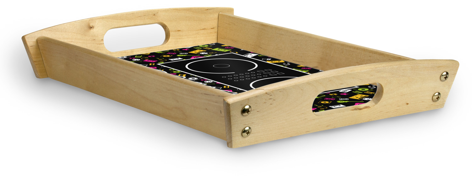 This serving tray with handles features square edges and two rounded sides, creating a very modern look. Each side is fabricated from a beautifully cut, natural wood. The bottom of the interior of the tray displays your customized design in bright, vibrant color. The tray is sold in both a black color and a natural wood look. Each variation of the wood serving tray has two sizes: Small, which is 14" x 10" x 2.25", and Large, which is 19.5" x 13.5" x 2.75".