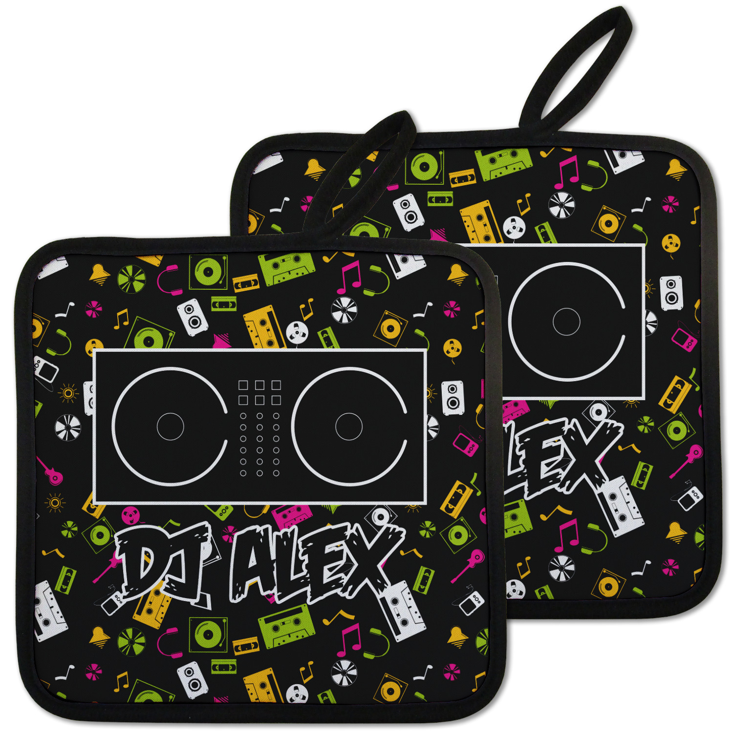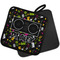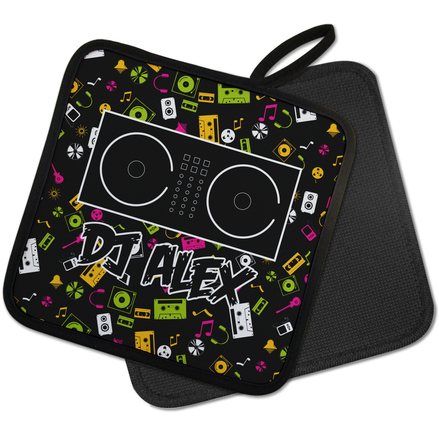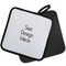 Our personalized pot holders feature a neoprene front that displays your personalization in vibrant colors. The backing of the hot pot holder is rubberized; the textured backing allows you to have a great grip when using this custom pot holder. The two materials are joined with a sleek, black trim, and the holder also includes an attached loop for hanging and storage. The pot holder is approximately 8.75 inches by 8.75 inches and 0.25 inches tall, while the fabric loop is 2.5 inches long. You can purchase a kitchen pot holder by itself or as a set of 2. We also offer a set including one pot holder and one oven mitt.