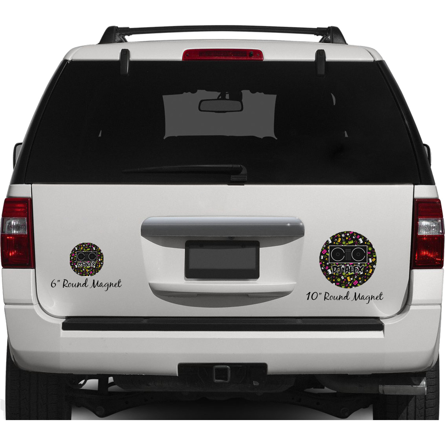 Your personalized car magnets are available for purchase in two shapes and two sizes. We carry round and square editions; each shape can either be 6 by 6 inches, or 10 by 10 inches, depending on your needs. Both versions are 1 millimeter thick, which is considered, within the industry, as the ideal thickness for automobile magnets. The magnetic car decals will adhere to any smooth, metal surface of your cars body, such as the trunk door or a side panel. However, please note that some vehicles are constructed from fiberglass bodies, which prevents the adhesion of anything magnetic. We advise that you test your vehicle before purchasing these magnets.