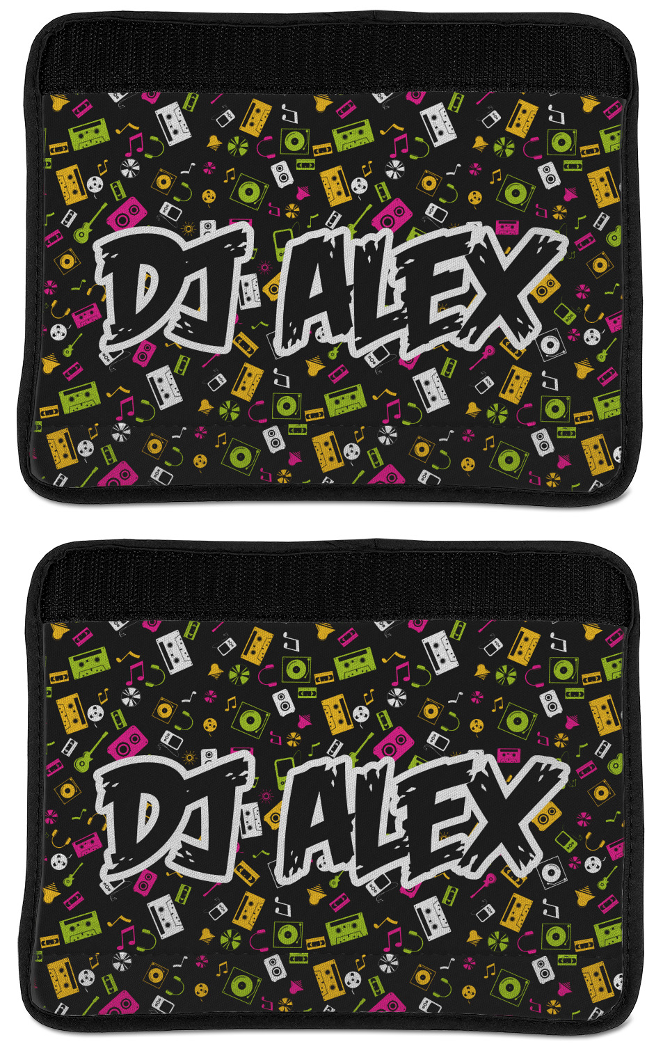Made from neoprene, our seat belt strap covers wrap around the belt itself and have a Velcro tab for easy attachment and closure. The belt's edges are trimmed with a black polyester for a secure finish. Each cover is 9.5 by 7 inches when open and 9.5 by 2.5 inches when closed. We print your personalized design on the face of the seat belt pad.
