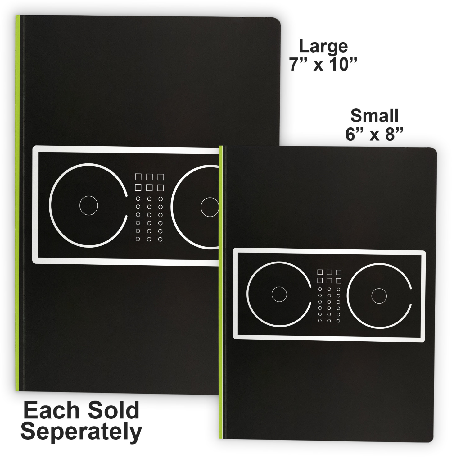 We offer these notebooks in two different sizes. The small notebook is 8" x 5.75", and fits snugly in purses or totes. The large notebook measures at 10" x 7.25", and can be carried in briefcases and backpacks.