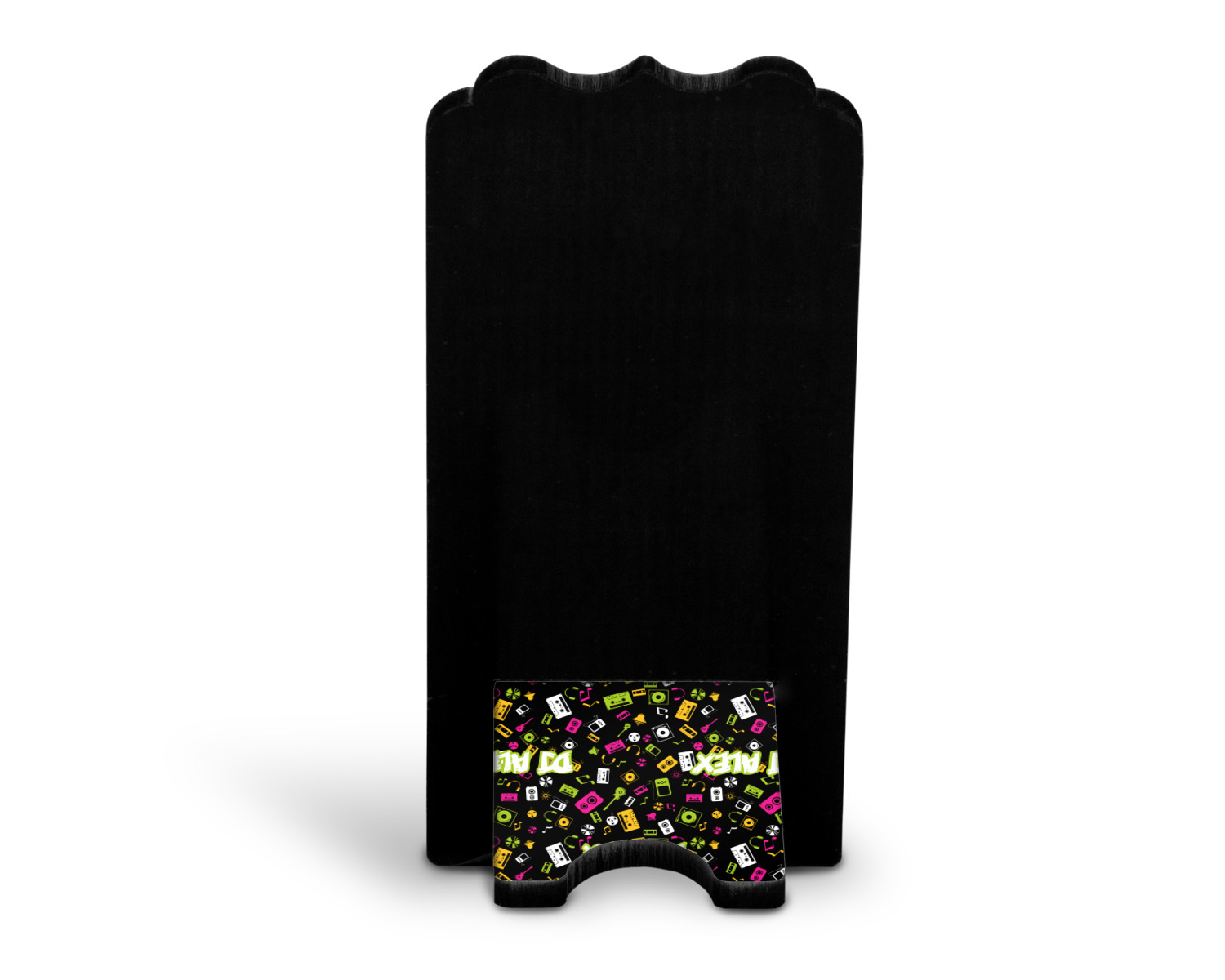 These cell phone holders are comprised of two hardboard pieces, that lock into and steady one another. The bottom part of the mobile phone stand is spacious enough to support both your phone and your charger, while it is not in use. We print your customization atop the face of this stand, while the remaining sides are a sophisticated, black color.