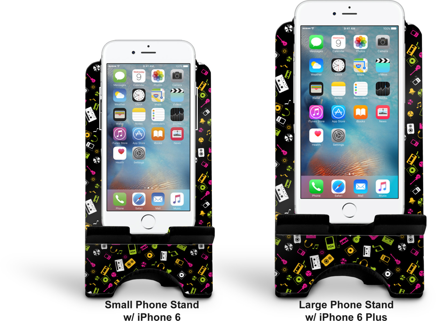 To meet your needs, we offer four variations of this IPhone stand. The backboard of the first version is shaped as a plain, yet sleek rectangle, and is available in two sizes. Our smaller size is approximately 4 by 3.25 by 7 inches, while the larger model is 4 by 3.77 by 8.5 inches. Alongside this model, we also provide you with a more decorative option. The upper part of our second version features a curved edge, for a classy, suave appearance. This phone holder is also sold in two sizes: a smaller version, which is 4 by 3.25 by 7 inches, and our larger model, which is 4 by 3.77 by 8.5 inches. Both models will support large phones, but the larger model is better if you wish to proudly display your personalized design.