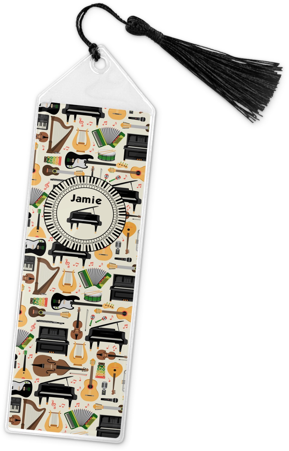 Your personalized bookmark is made of a sturdy, clear vinyl, and is approximately 7.5" x 2.25". We display your personalization on vinyl inserts that are placed on both sides. Accompanying each book marker is a black, fringe tassel that attaches to the reinforced, triangular header.