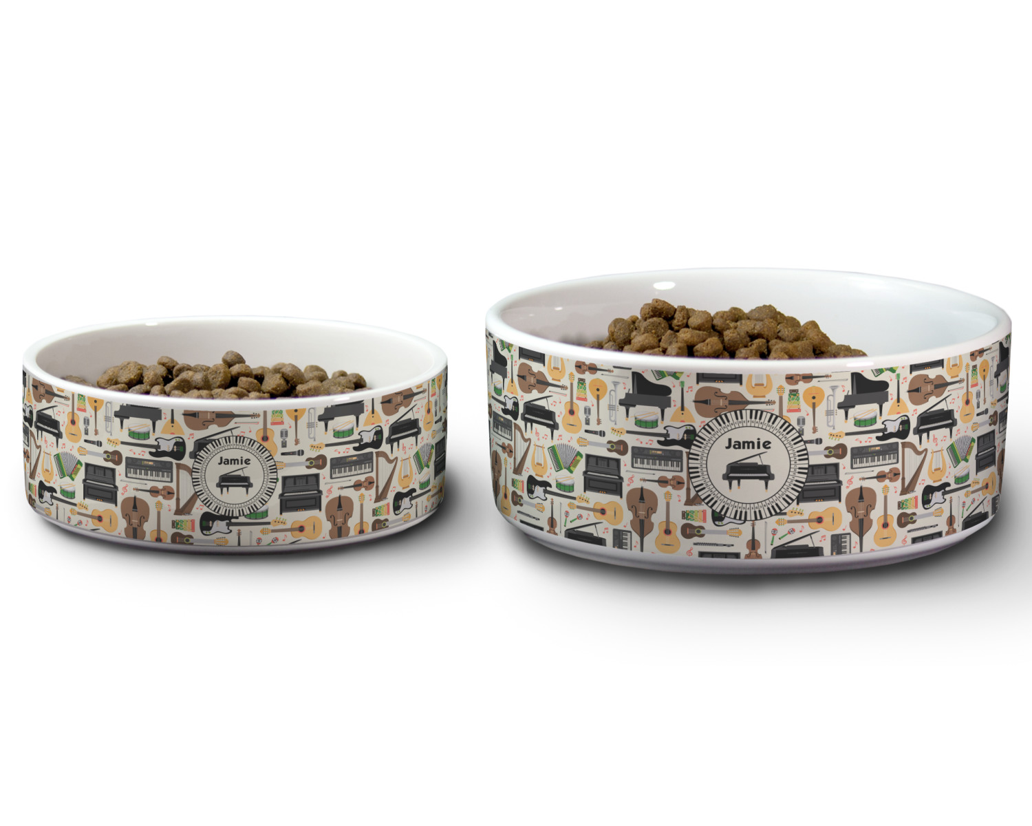 We carry these custom dog bowls in two available sizes: medium and large.The medium is 6 inches in diameter and 2.5 inches tall, and can therefore suit pets who eat up to 2.5 cups of food per meal. The large pet bowl is 7 inches in diameter and 3 inches tall, and suits pets who require up to 4.5 cups of food per meal.