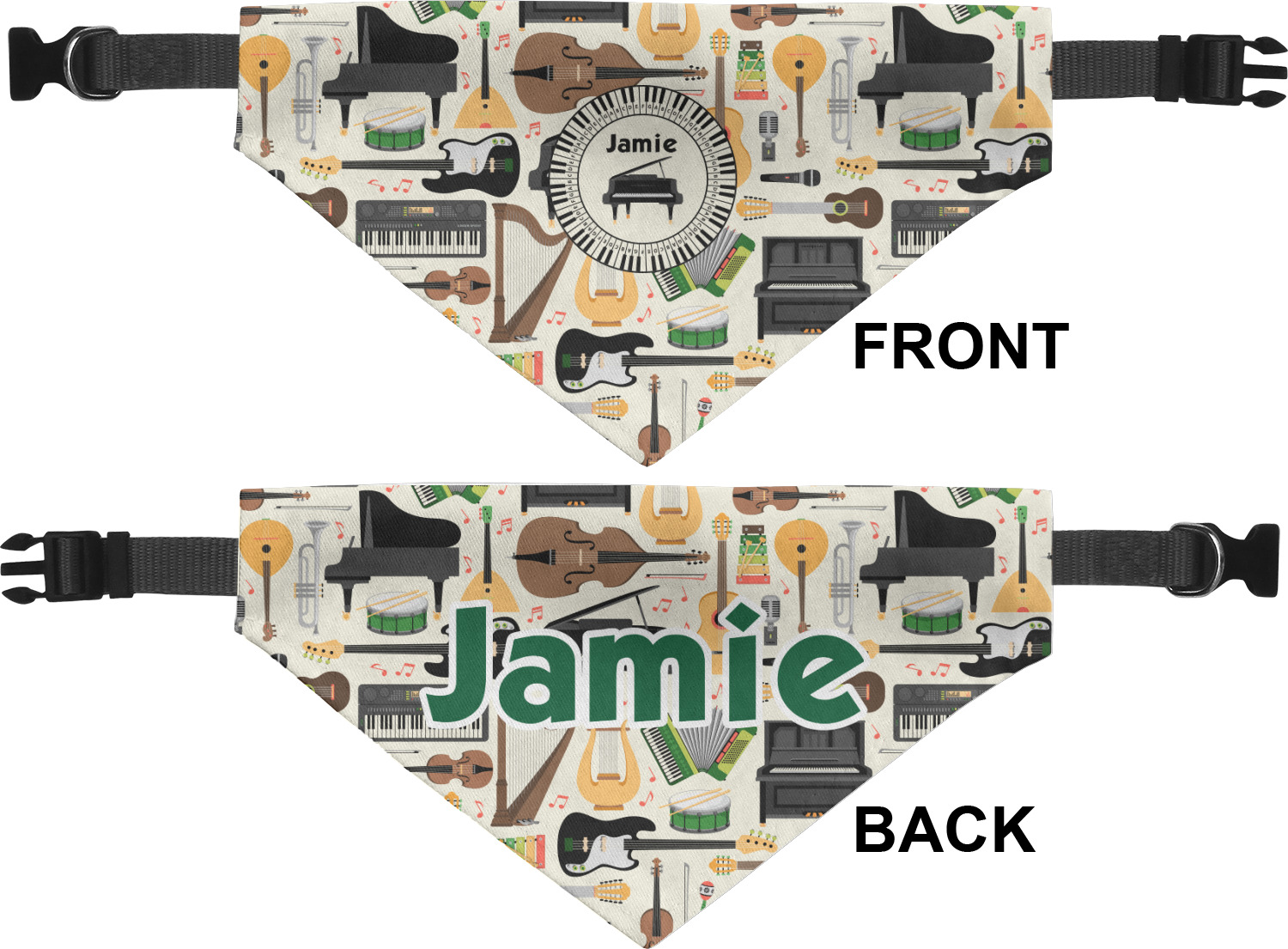 We print the front and back of these dog bandanas with your customized design. The bandana itself is made from a durable polyester, sewn together with a gap large enough to accommodate any collar. Regardless, the bandana includes a plain black, canvas collar with plastic snaps, that can easily be removed if desired. These dog bandana collars are available in four sizes: small, medium, large, and extra large. Please see our sizing chart for more information regarding the dimensions of each size.