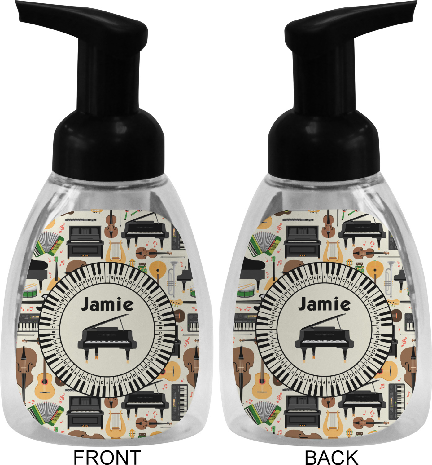 This soap dispenser is made of a robust plastic and has a clear base. The included soap pump is available in black or white color. This dispenser is 6.5 inches tall, 3 inches wide, and 2 inches deep. We display your customized designs on the front and back sides of these foaming hand soap dispensers.