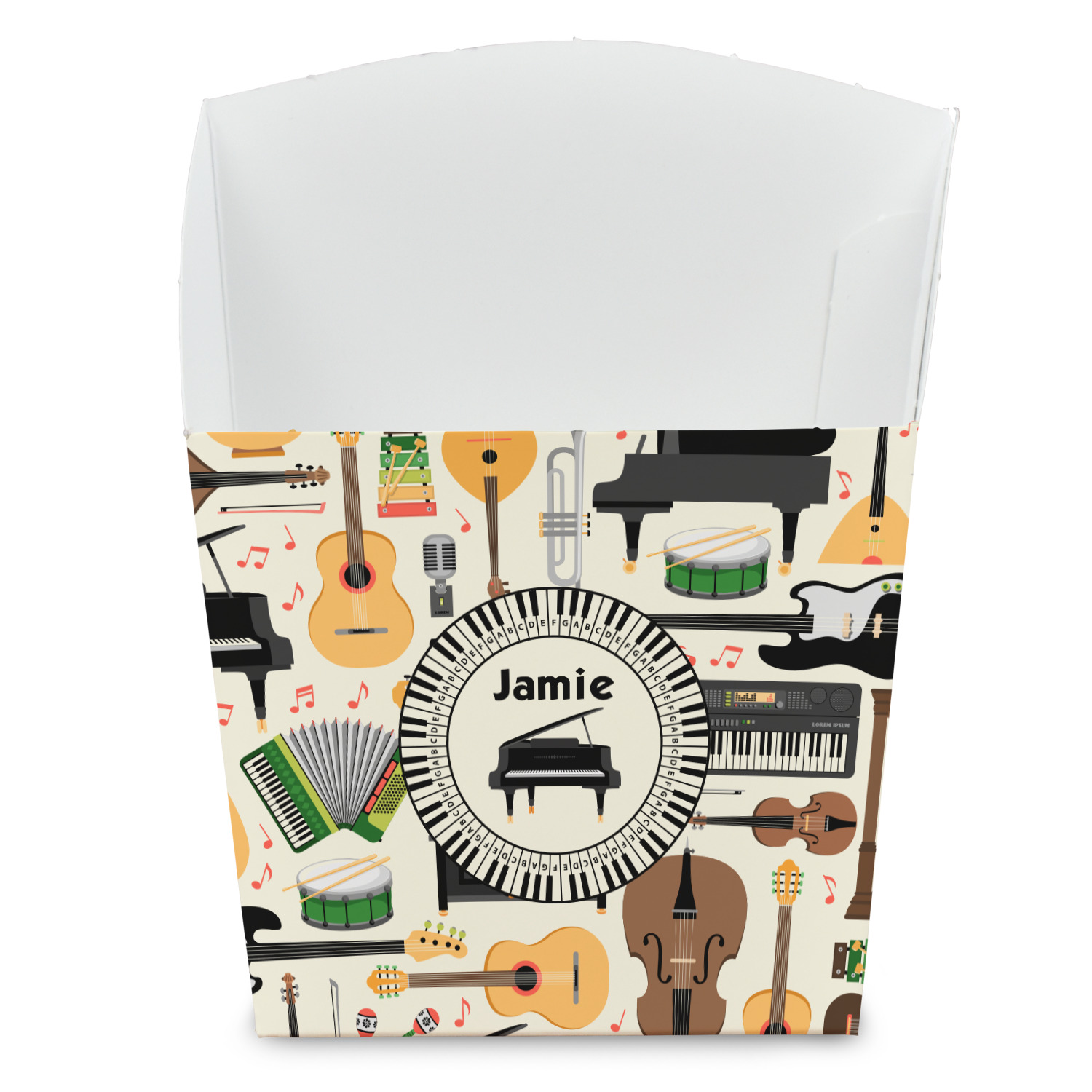 The background in the design is part of a set of music backgrounds - so it can easily be swapped out for a different background. We have a number of other musical frames / labels that you can also choose from. For the center graphic, all the musical instruments are in our system, so you can easily switch out the instrument.