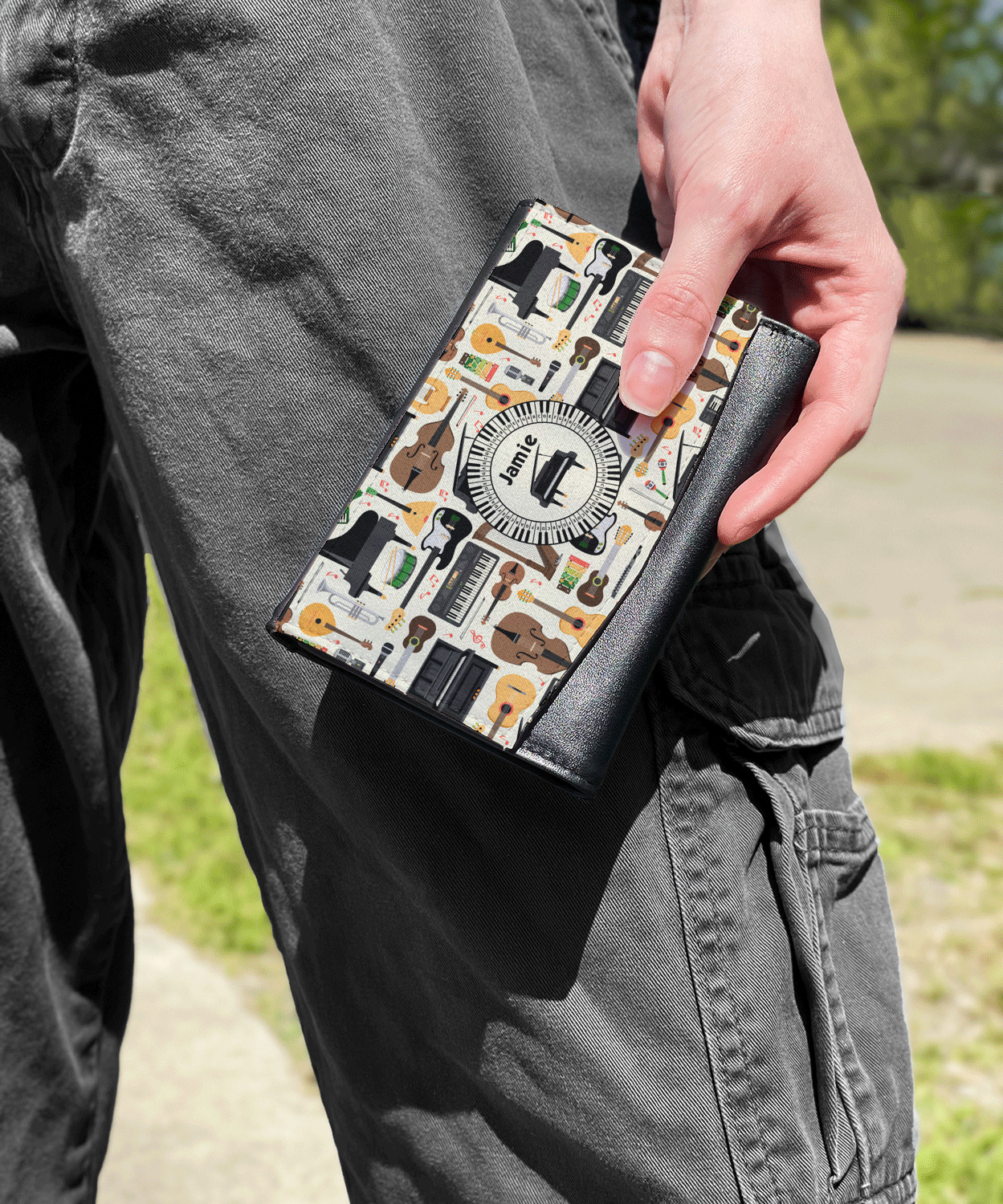 The compact size of this wallet - 5.5in wide, 3.5in tall and 0.75in thick when folded - makes it perfect to hold in hand and small enough to fit in a clutch or a normal size purse. The outside flap is customized with your choice of artwork and closes with a snap closure - with two different snaps to allow it to be adjusted when storing more items - to securely fasten the flap.