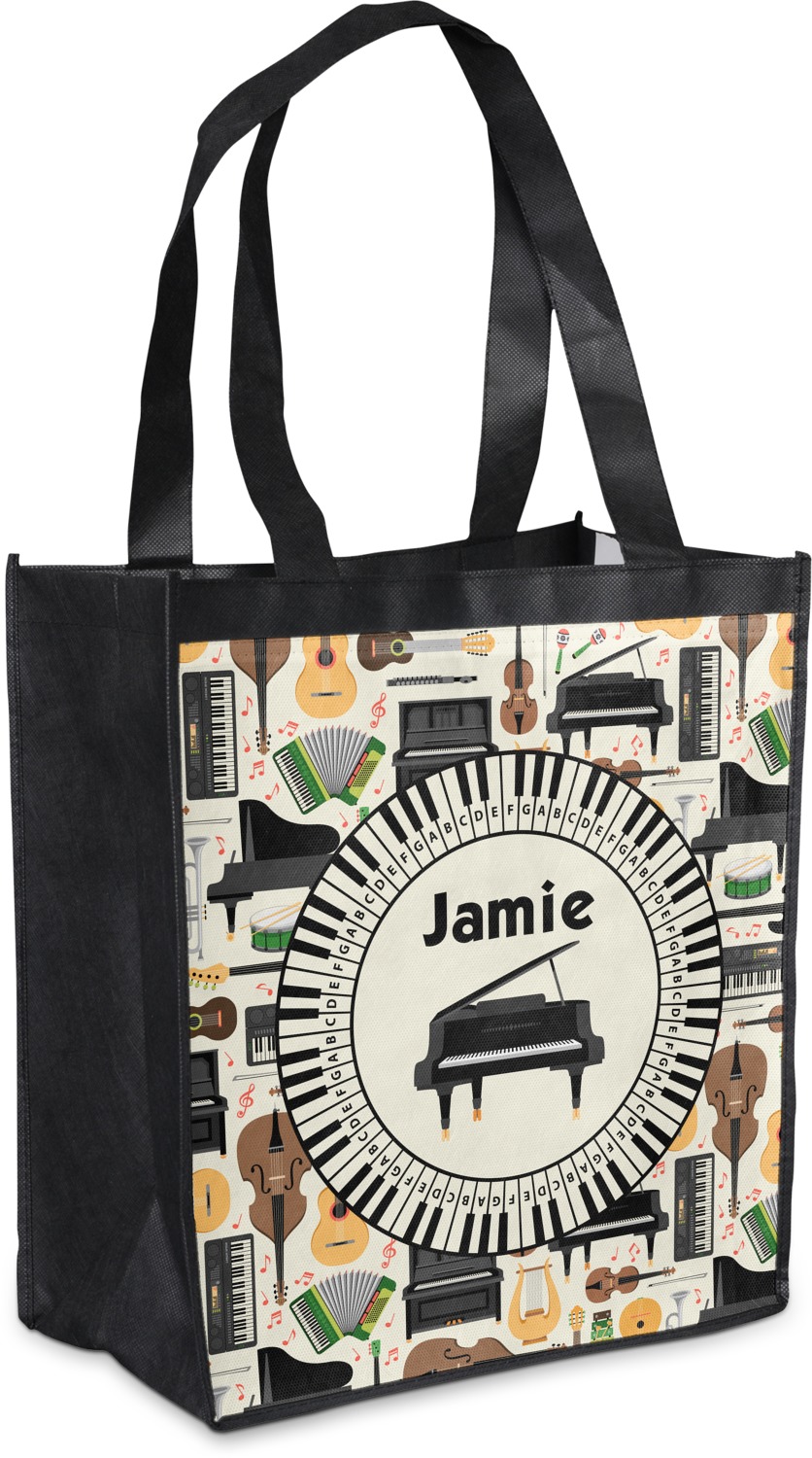 Made from a durable, biodegradable material, these reusable shopping bags can support up to 30 pounds of weight. With two large handles, measuring at 8.5 inches each, these personalized tote bags are easy to carry to your vehicle or home. The bag itself is 12 by 13.5 inches, and can expand to a depth of 7 inches. Your customization is printed on both the front and back, while the remaining sides, trim, and handle are a sleek, charcoal black.