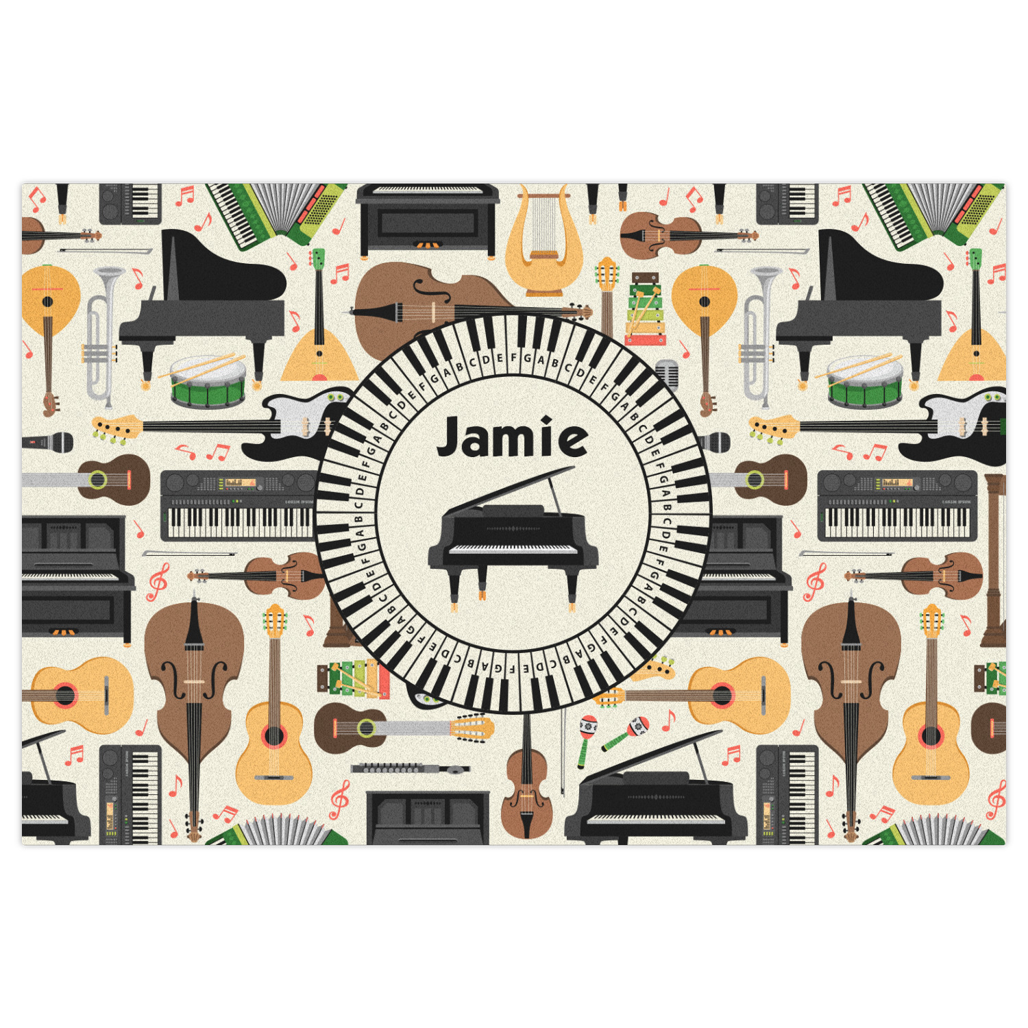 The background in the design is part of a set of music backgrounds - so it can easily be swapped out for a different background. We have a number of other musical frames / labels that you can also choose from. For the center graphic, all the musical instruments are in our system, so you can easily switch out the instrument.