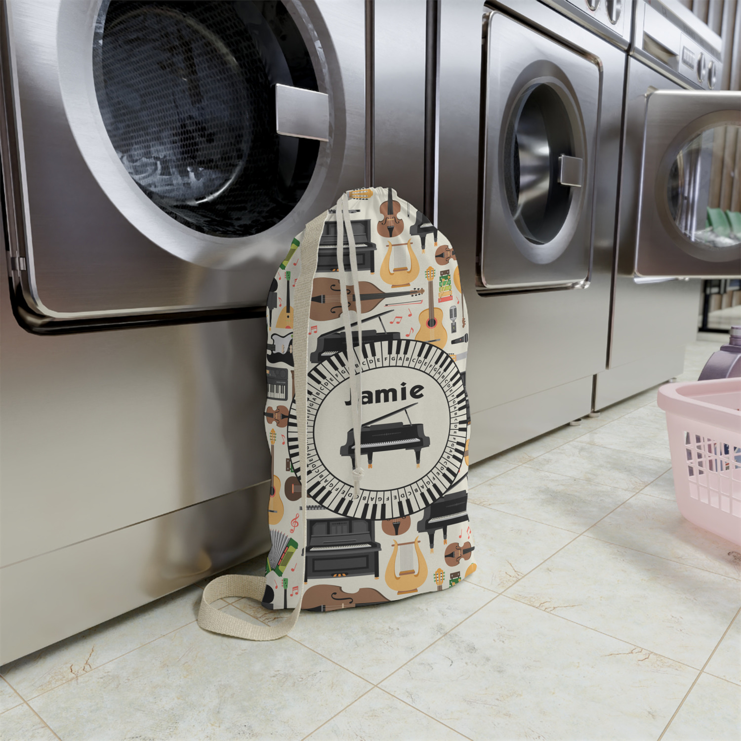 Carry your laundry in style with these customized laundry bags. Available in two sizes, featuring a natural colored woven strap and a cinch cord, these bags hold a lot of clothes or anything else you want to fit in them.