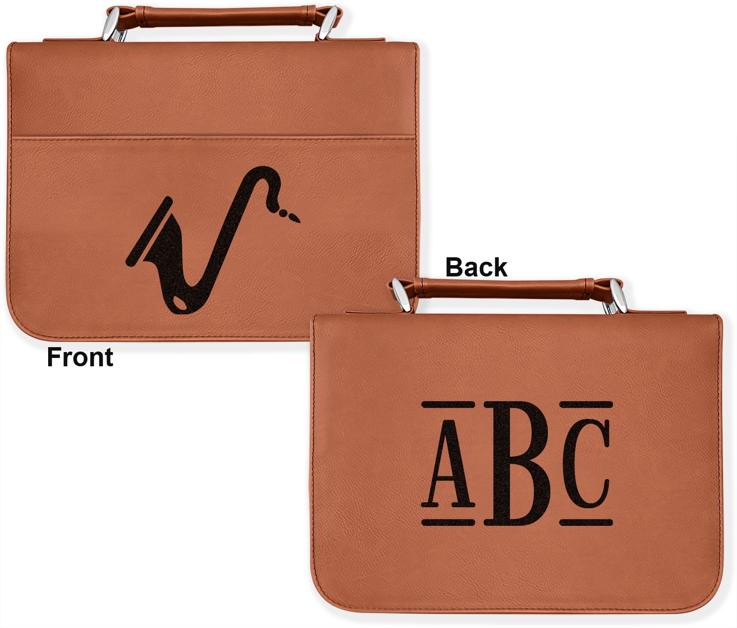 These book covers are fabricated from a fine leatherette in a warm, cognac shade of brown. A wide pocket spans across the front of the book jacket [2,400] and can store any loose papers or notes that you wish to keep. The interior of this personalized Bible cover includes slots on both sides to house the covers of your Bible, and keep it in place. The inside of the spine has a small elastic band to secure a pen. A zipper lines three sides of the cover, while the fourth side features a reinforced handle that allows for easy transport of your enclosed book.