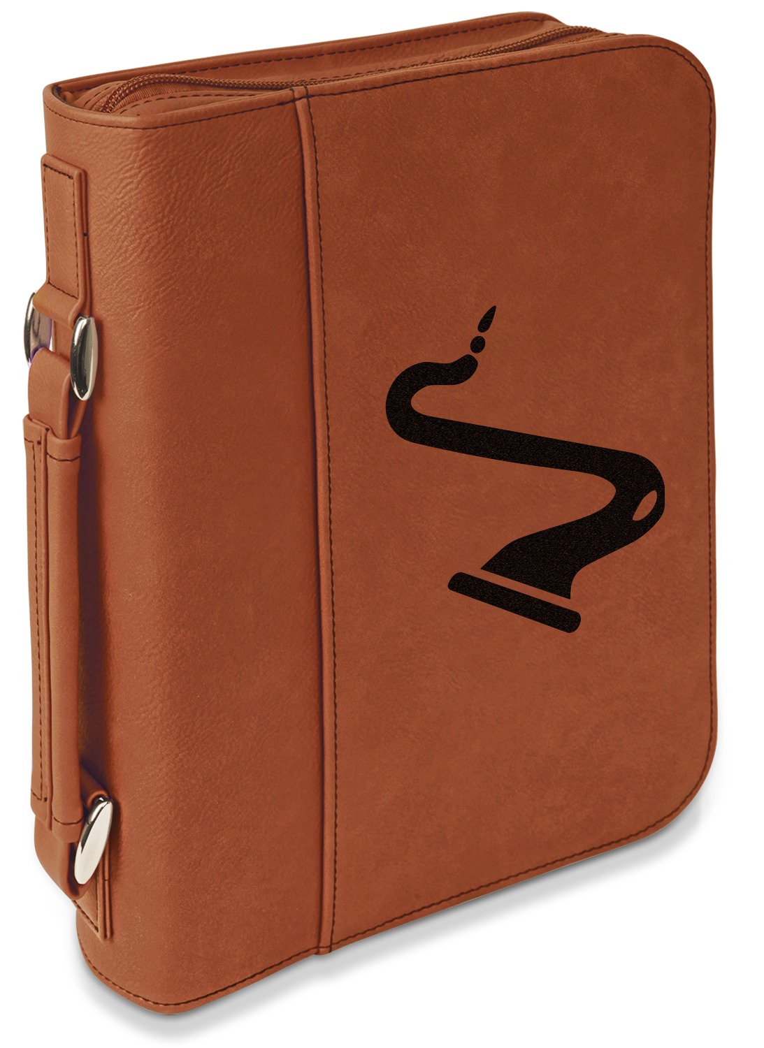 These book covers are fabricated from a fine leatherette in a warm, cognac shade of brown. A wide pocket spans across the front of the book jacket [2,400] and can store any loose papers or notes that you wish to keep. The interior of this personalized Bible cover includes slots on both sides to house the covers of your Bible, and keep it in place. The inside of the spine has a small elastic band to secure a pen. A zipper lines three sides of the cover, while the fourth side features a reinforced handle that allows for easy transport of your enclosed book.