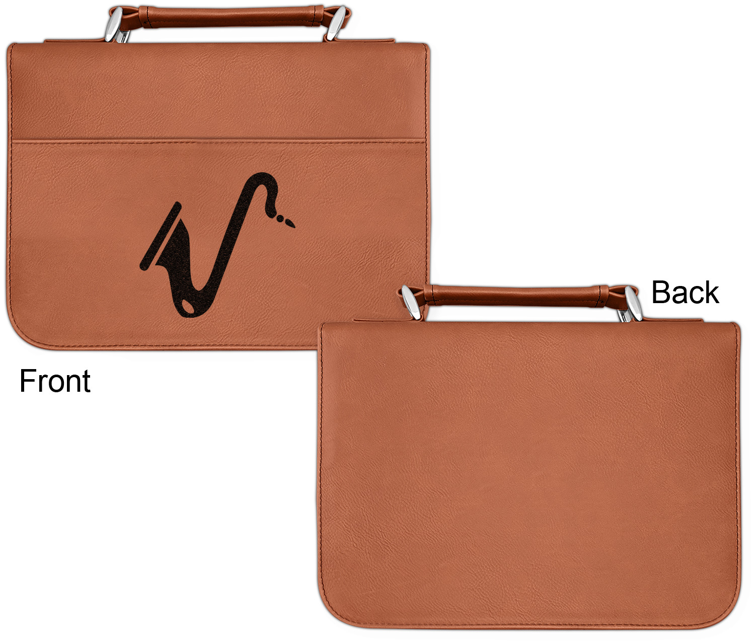 These book covers are fabricated from a fine leatherette in a warm, cognac shade of brown. A wide pocket spans across the front of the book jacket [2,400] and can store any loose papers or notes that you wish to keep. The interior of this personalized Bible cover includes slots on both sides to house the covers of your Bible, and keep it in place. The inside of the spine has a small elastic band to secure a pen. A zipper lines three sides of the cover, while the fourth side features a reinforced handle that allows for easy transport of your enclosed book.
