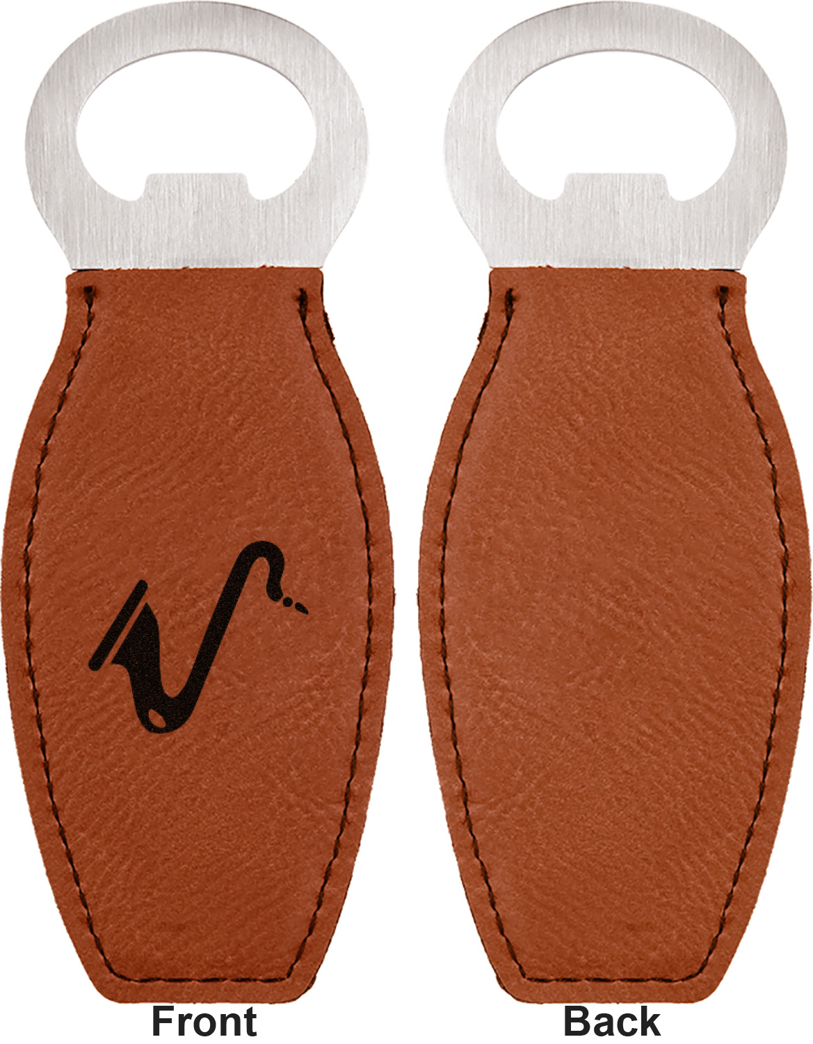 Built from stainless steel, these custom bottle openers are wrapped in a cognac-colored leatherette. Sharp, black stitching lines the edges for extra durability and a finished touch. Your personalization is laser-engraved onto the surface of this leatherette, leaving behind a crisp, black coloration. At 4.6 by 1.8 inches, this beer bottle opener gives you much of leverage when trying to open a stubborn bottle. On the opposite end of the opener, you'll find a magnet that you can use to display your new, unique bottle opener!