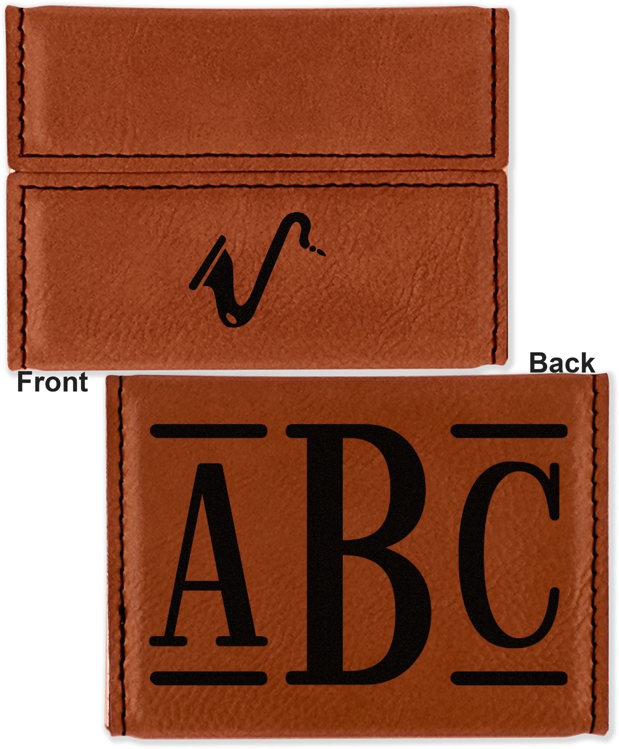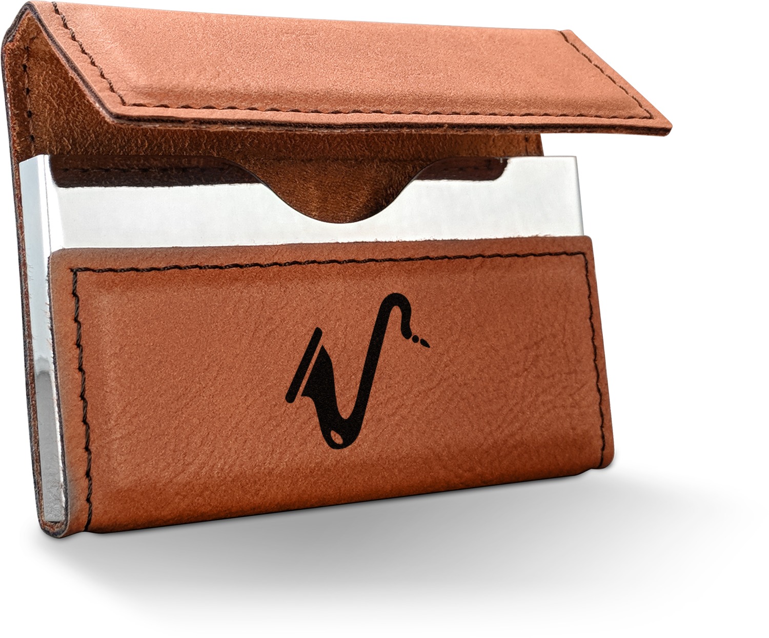 Your personalized design is laser engraved onto either the front, or the front and back of the card holder, depending on the model you purchase. Once engraved, the design will appear a darkened black against the cognac color of the leatherette.