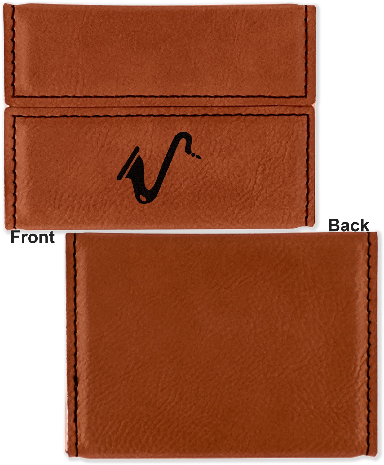 Your personalized design is laser engraved onto either the front, or the front and back of the card holder, depending on the model you purchase. Once engraved, the design will appear a darkened black against the cognac color of the leatherette.