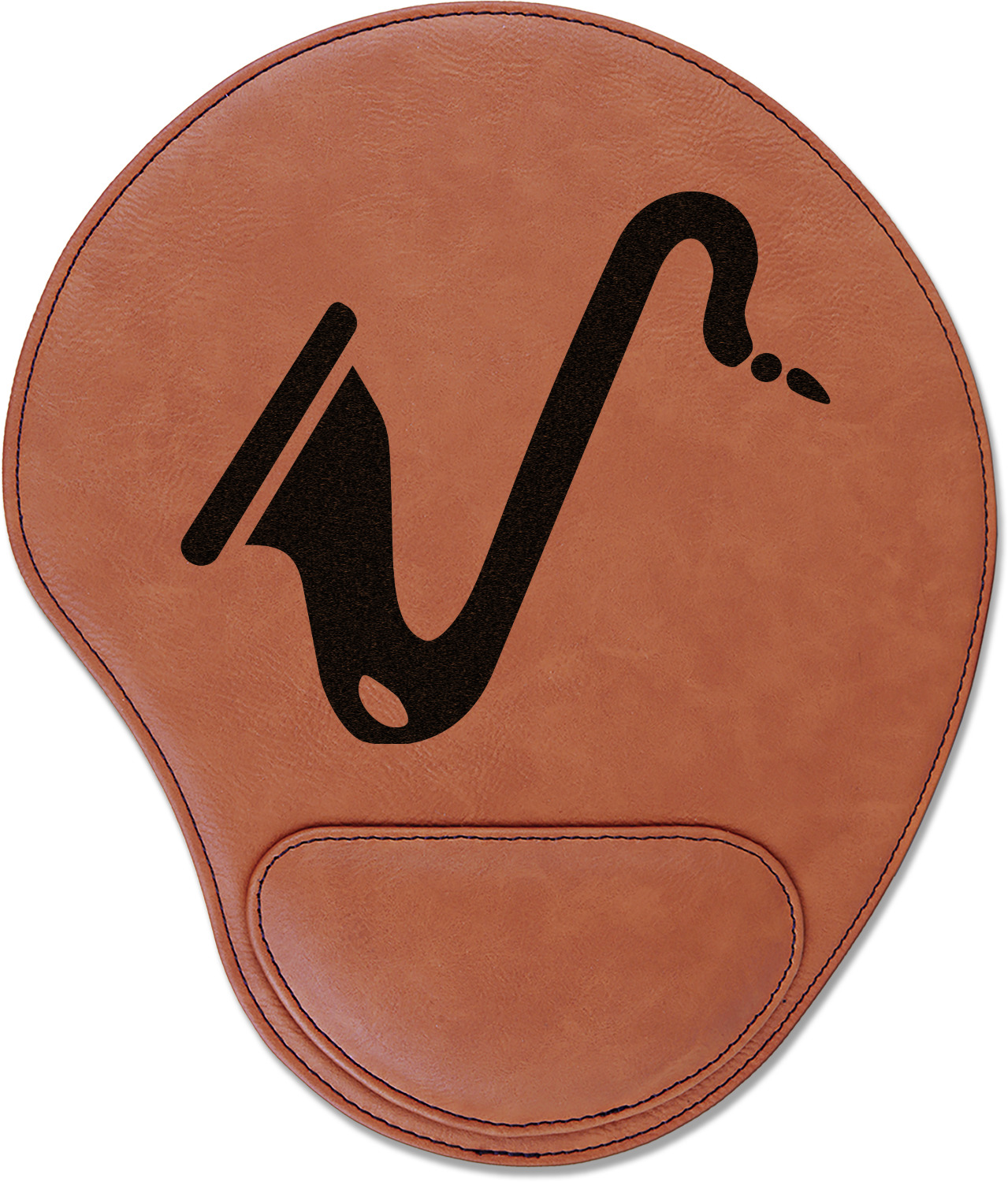In a rounded shape, this mouse pad is made of a luxurious, cognac-colored leatherette. The nature of this material allows your mouse to glide smoothly across its surface. Strong stitching lines the edges to guarantee stability and strength. As added support for tired wrists, your personalized mouse pad features a supportive wrist rest at its bottom. This model measures at 10.25" x 9", while its wrist pad is approximately 5" x 2.75", with a thickness of 0.75". Your personalized design is laser engraved into the front face of this mouse pad.