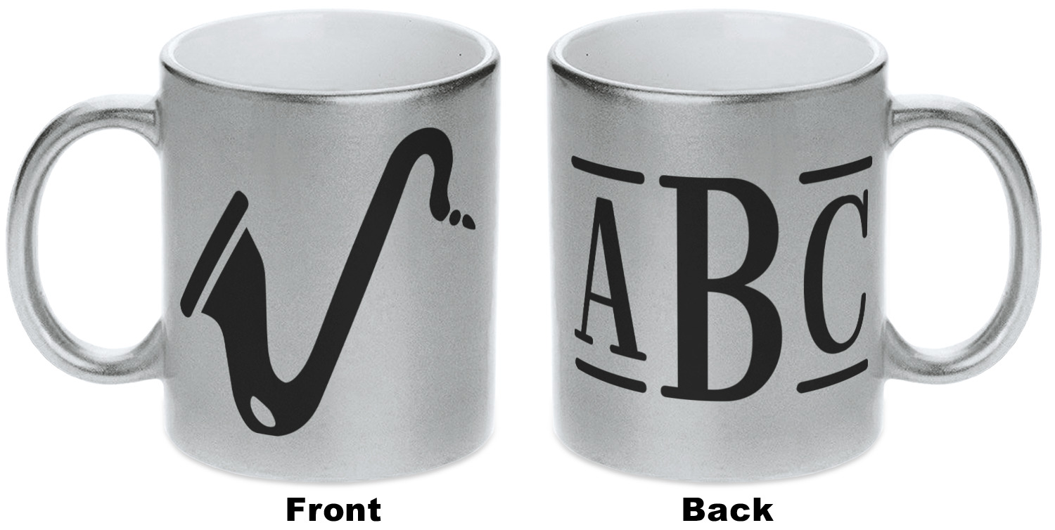 Our custom mugs are ceramic, which is great for keeping your tea or coffee warm! We offer two metallic mugs to personalize - Silver or Gold. Both styles hold around 11oz and have dimensions of approximately 3.75" x 3.5" x 4.75". Both the metallic mugs come in a matte finish and have glitter detailing to add a more pristine feel to the gold and silver base colors.