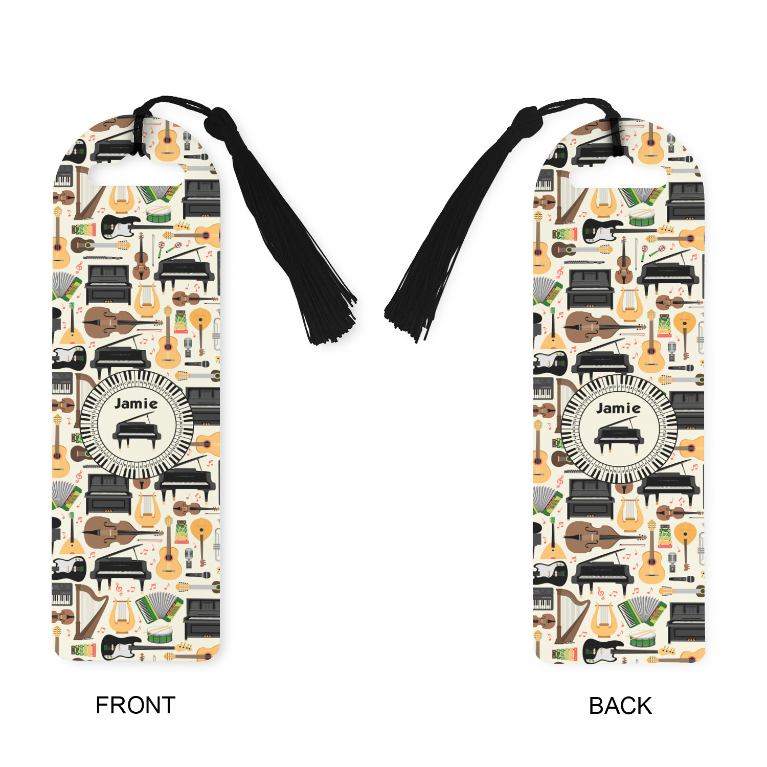 Made from a durable, flexible plastic, these bookmarks are printed with your custom design on them. With the tassel on them they make it easy to find your page in your book. These are a rectangular shape 7 1/4 inches tall with a rounded top and are approximately 2 1/4 inches wide.